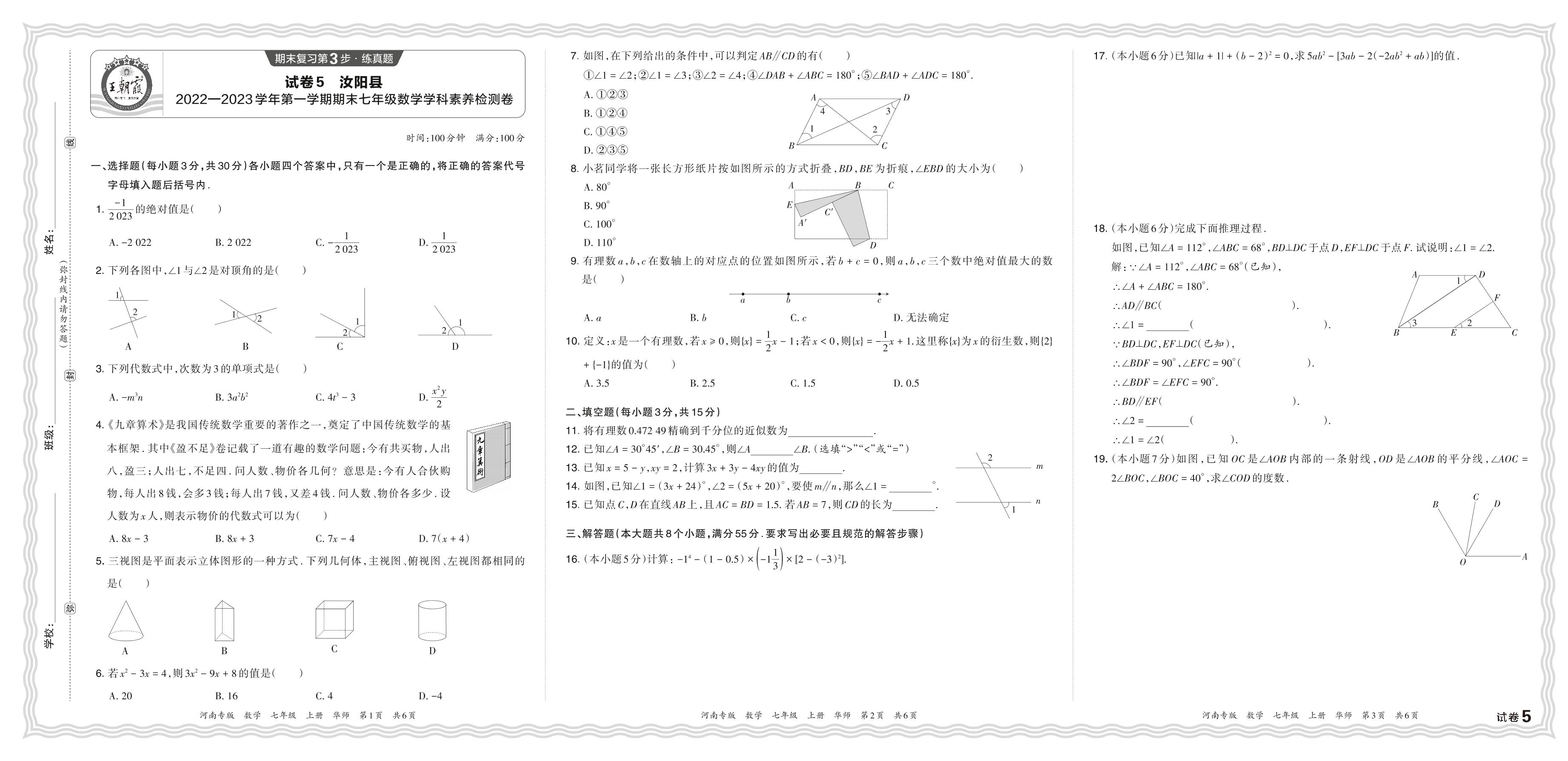 河南省洛阳市汝阳县2022—2023学年第一学期期末七年级数学学科素养检测卷(华师版)【5】