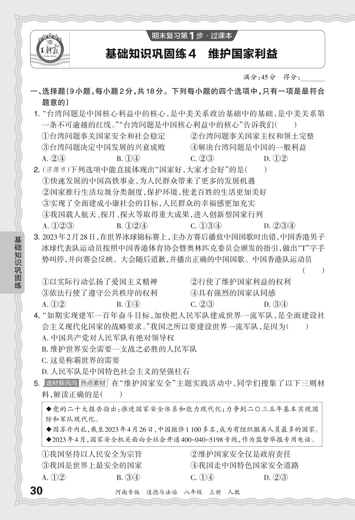 2023秋上册八年级道德与法治人教版 期末过课本·基础知识巩固练 维护国家利益_R231127093837963【4】