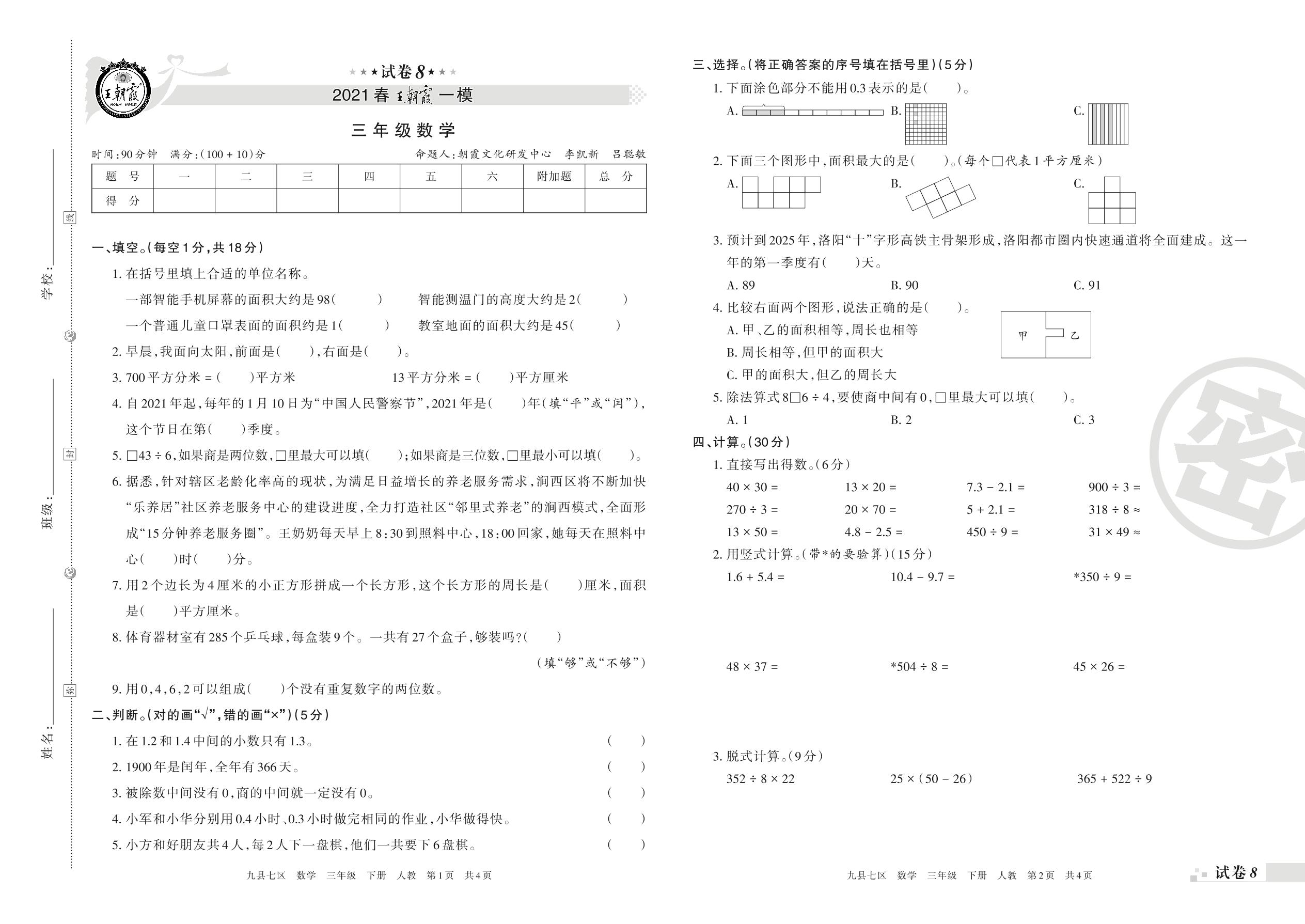王朝霞期末模拟卷三年级下册数学(人教版)_R21080484931【8】