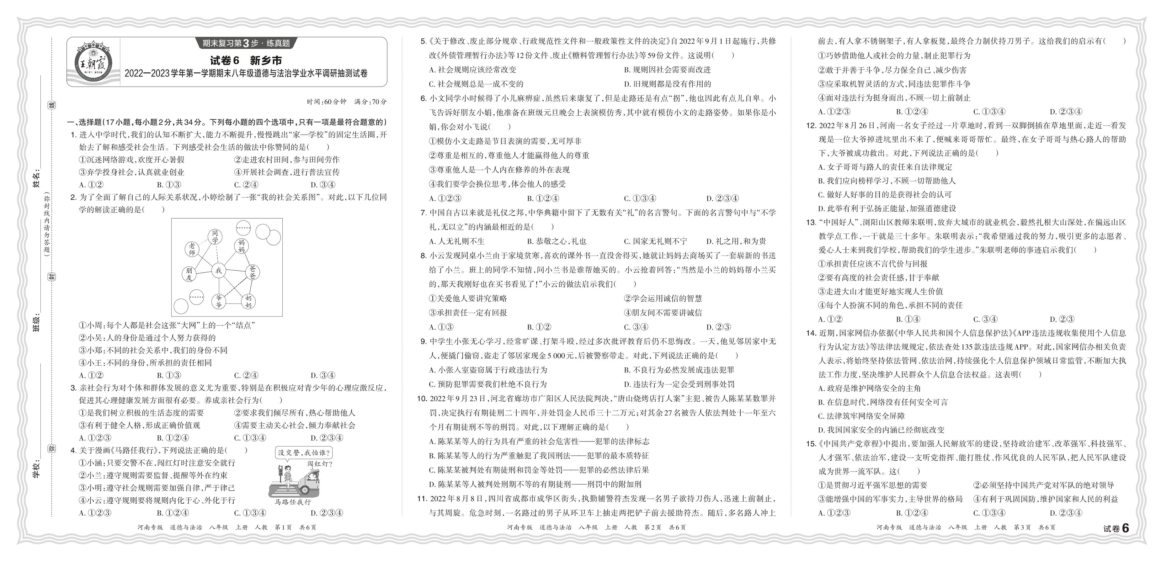 河南省新乡市2022—2023学年第一学期期末八年级道德与法治学业水平调研抽测试卷(人教版)【6】