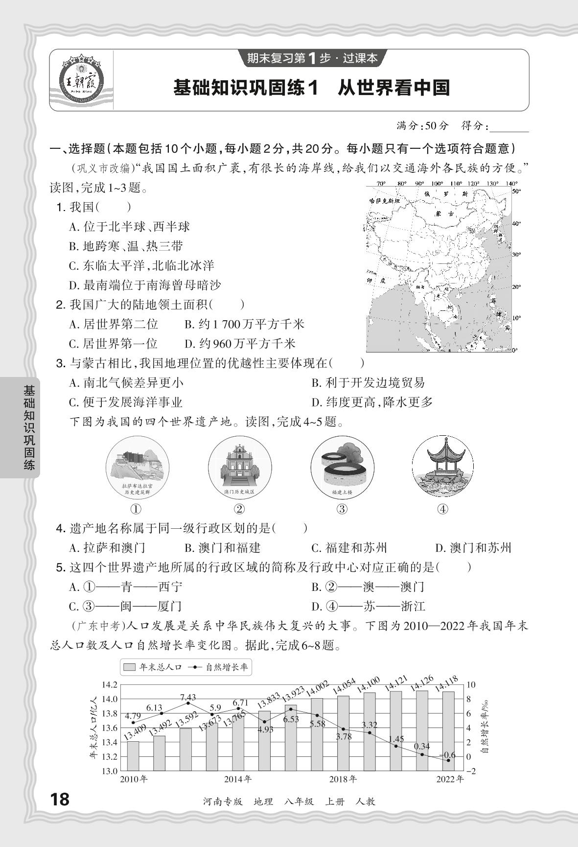 2023秋上册八年级地理人教版 期末过课本·基础知识巩固练 从世界看中国【1】
