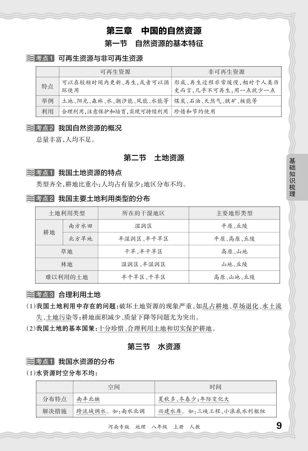 2023秋上册八年级地理人教版 期末过课本·基础知识梳理 第三章 中国的自然资源