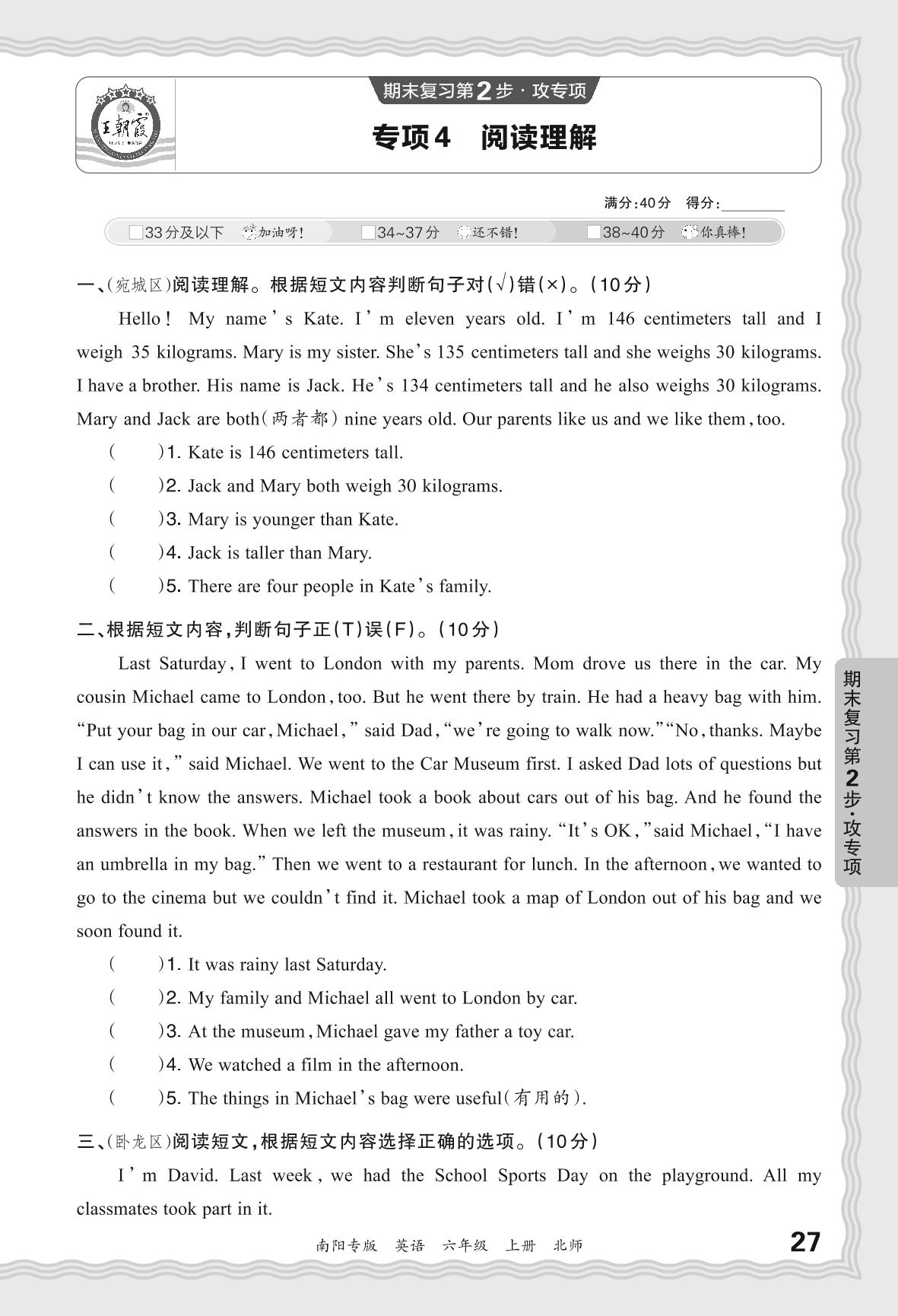 六年级英语北师版上册专项卷