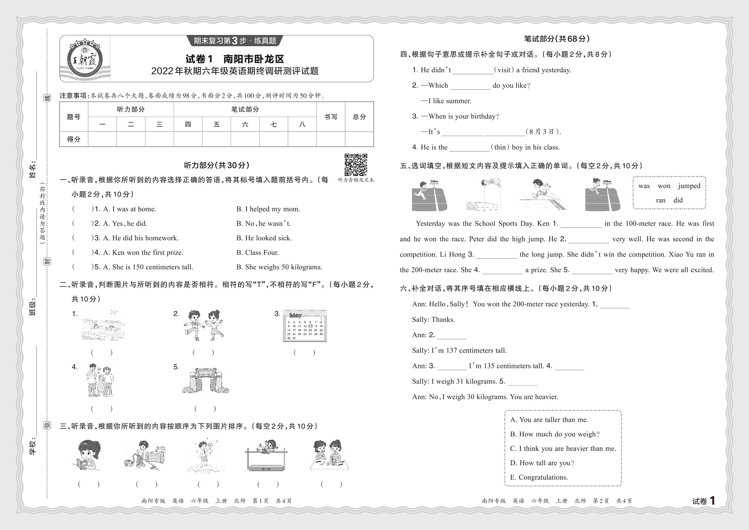 河南省南阳市卧龙区2022年秋期六年级英语期终调研测评试题(北师版)【1】