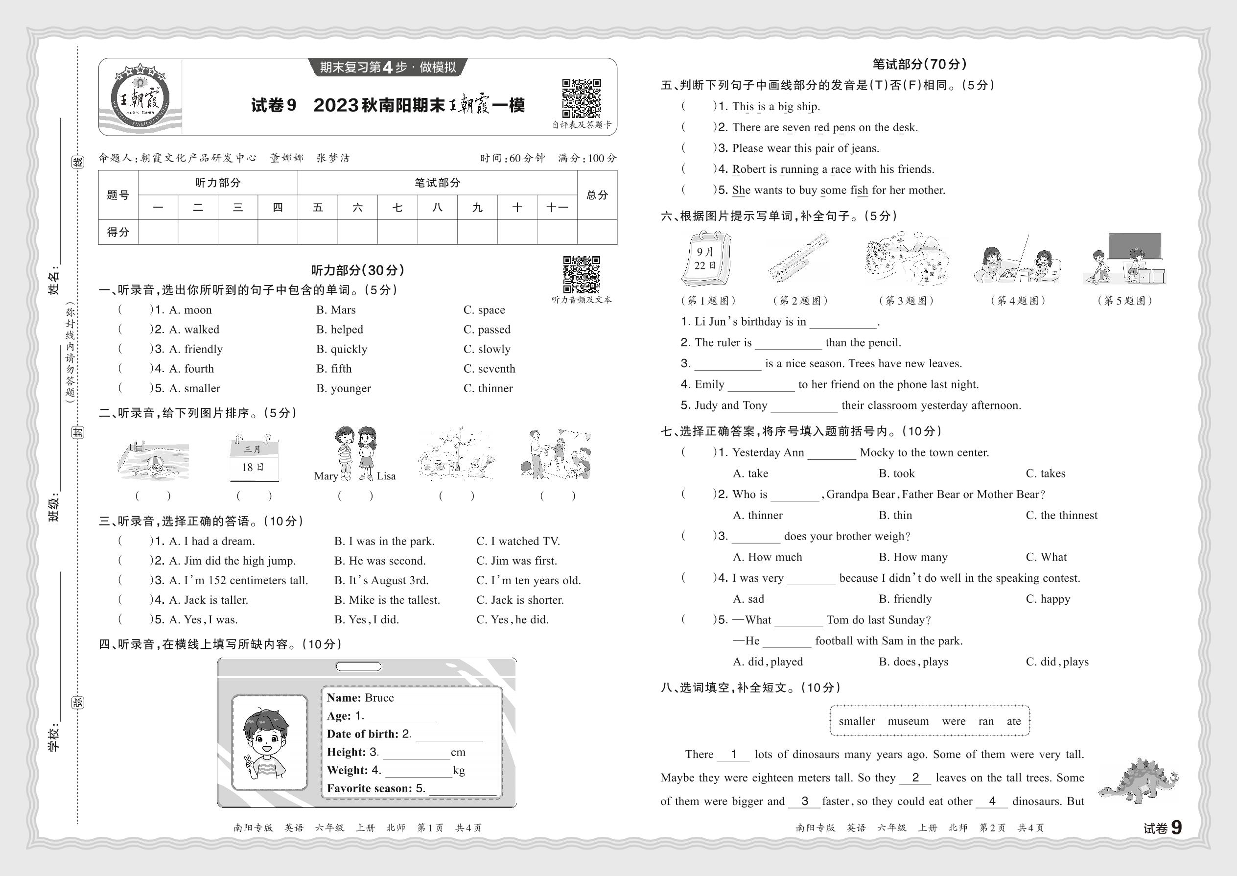 2023秋上册六年级英语北师版 河南南阳期末王朝霞一模【9】