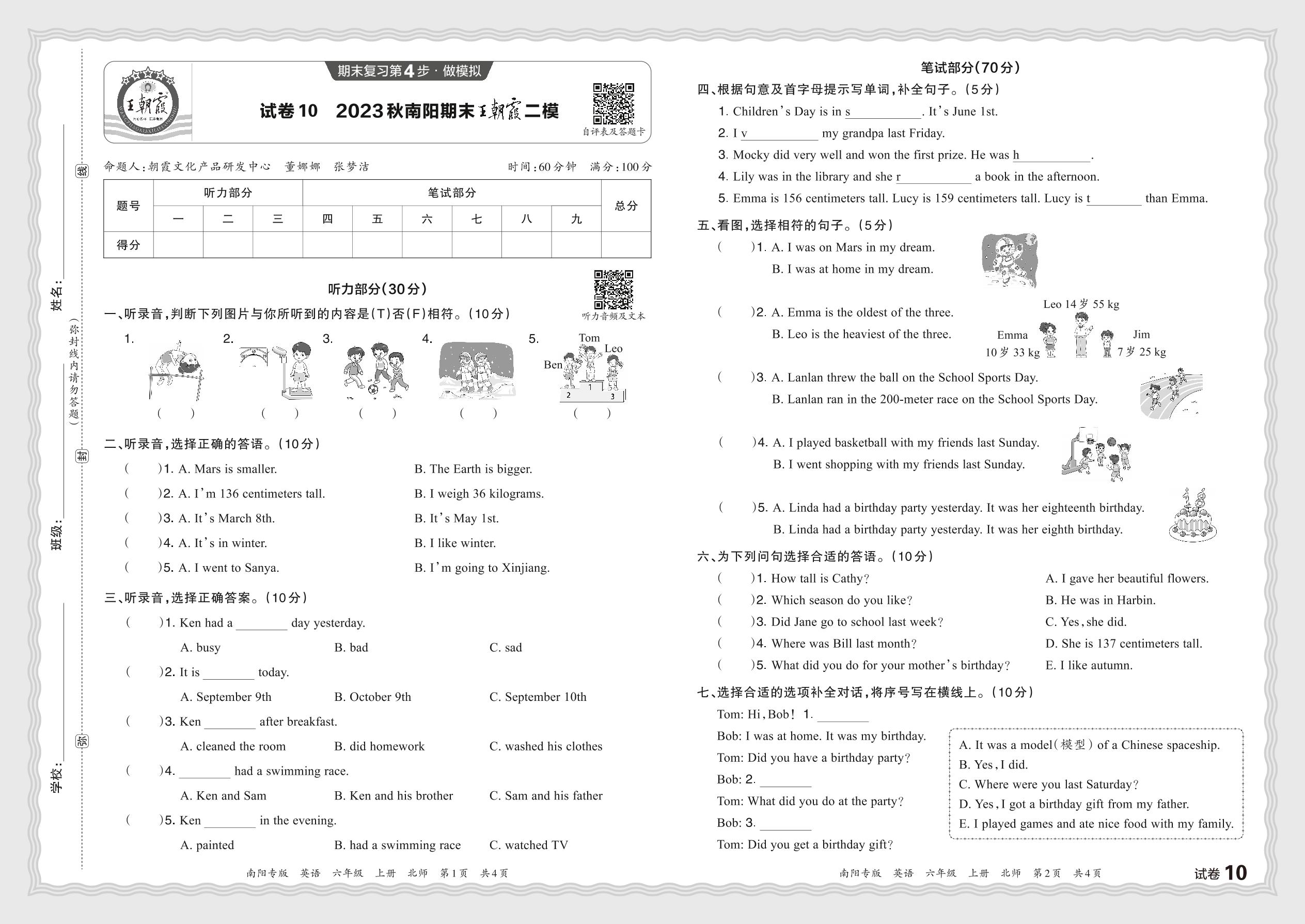 2023秋上册六年级英语北师版 河南南阳期末王朝霞二模【10】