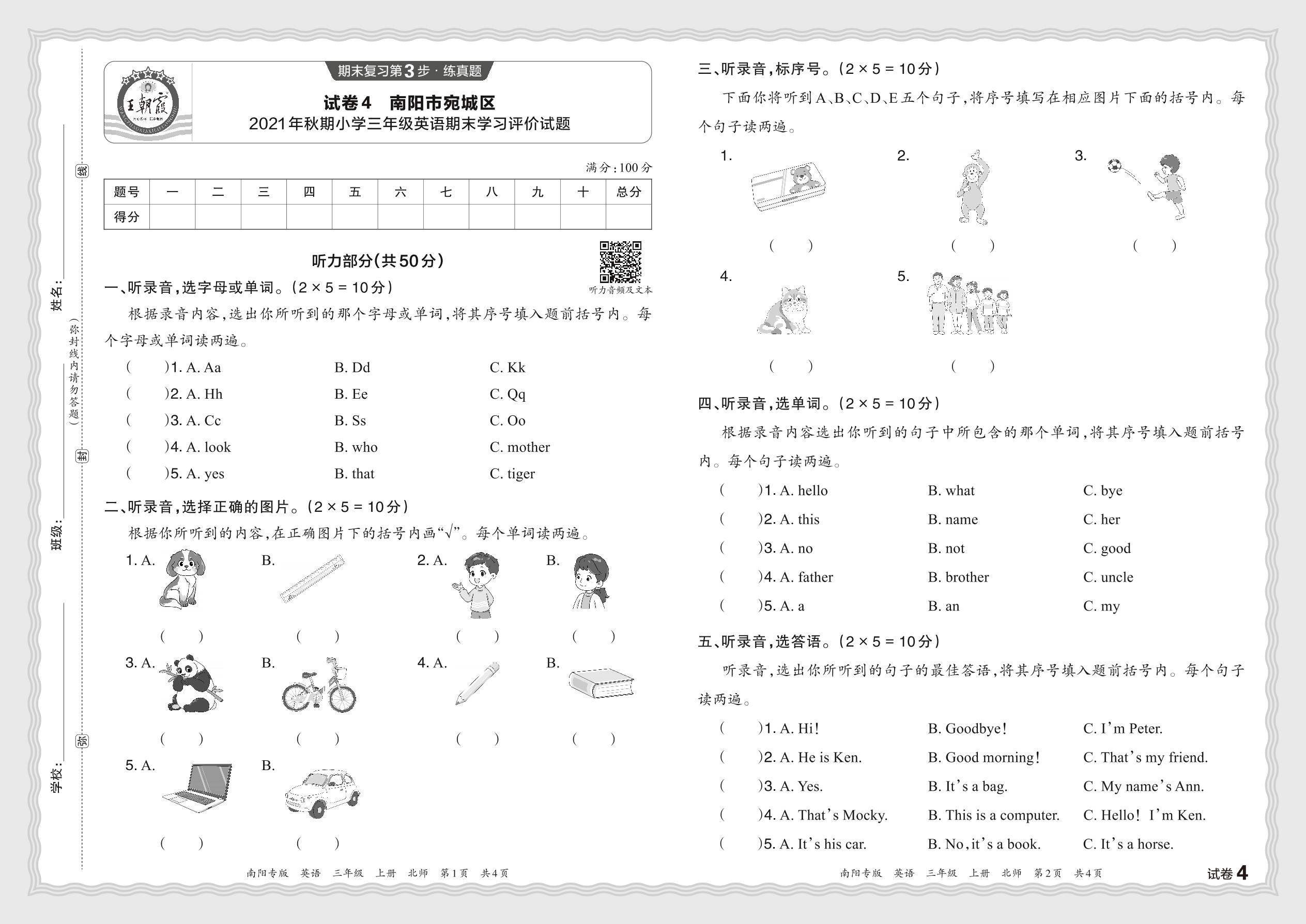 河南省南阳市宛城区2021年秋期小学三年级英语期末学习评价试题(北师版)【4】