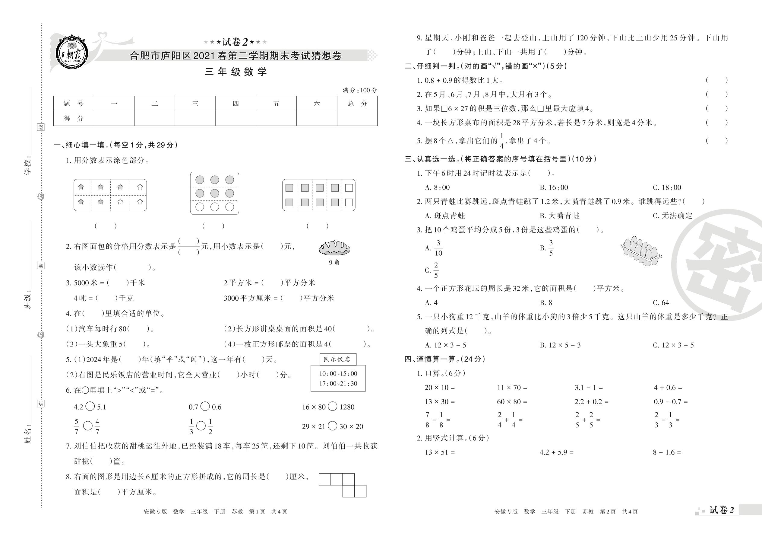 2019-2020学年第二学期合肥市庐阳区三年级数学试卷(苏教版)【2】
