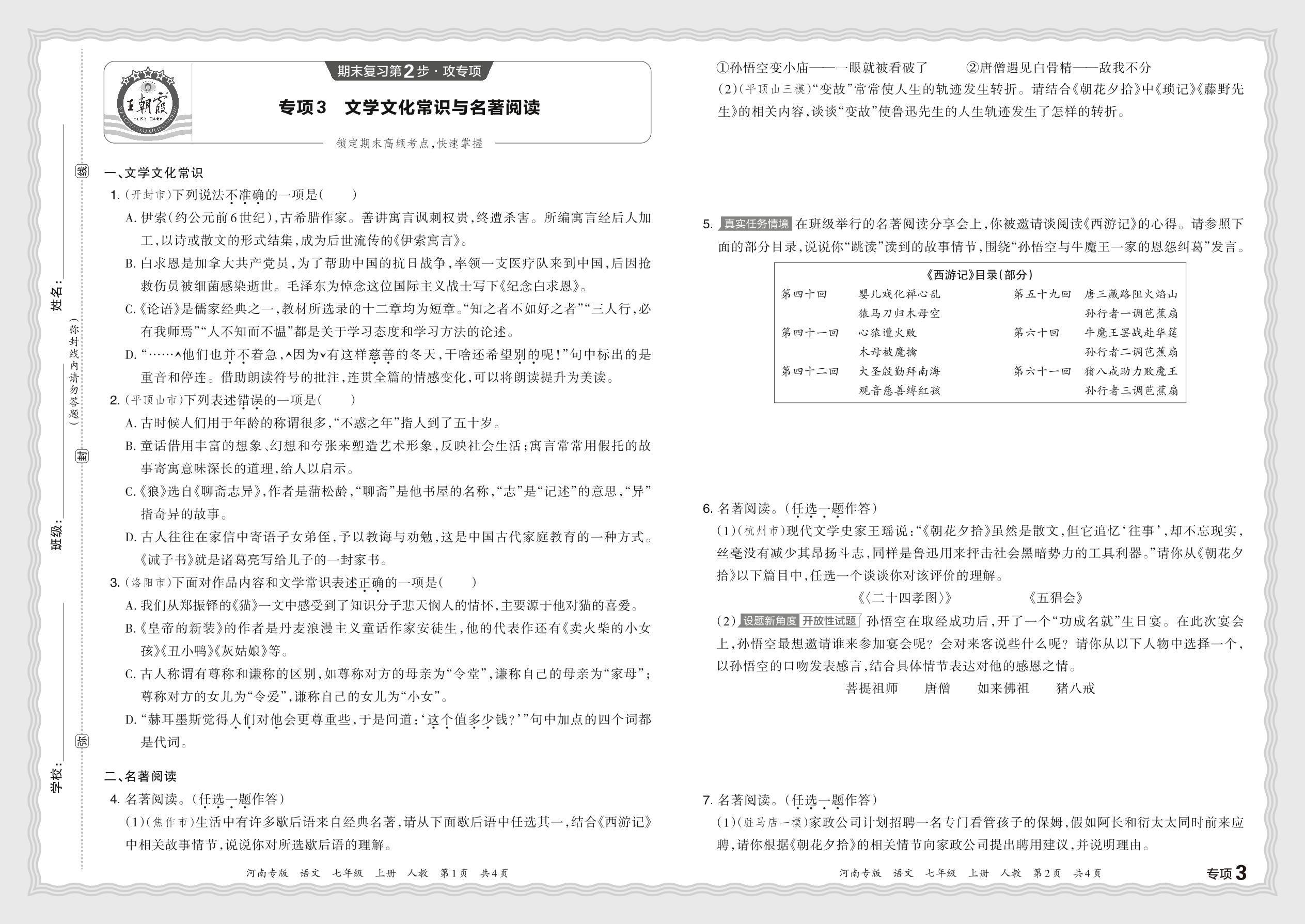 2023秋上册七年级语文人教版 期末专项卷·文学文化常识与名著阅读【3】