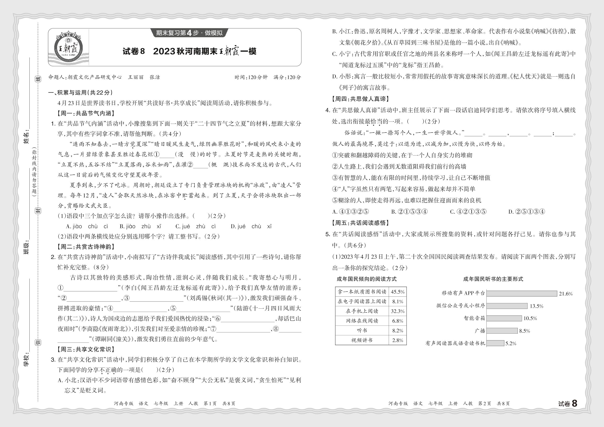 2023秋上册七年级语文人教版 河南期末王朝霞一模
