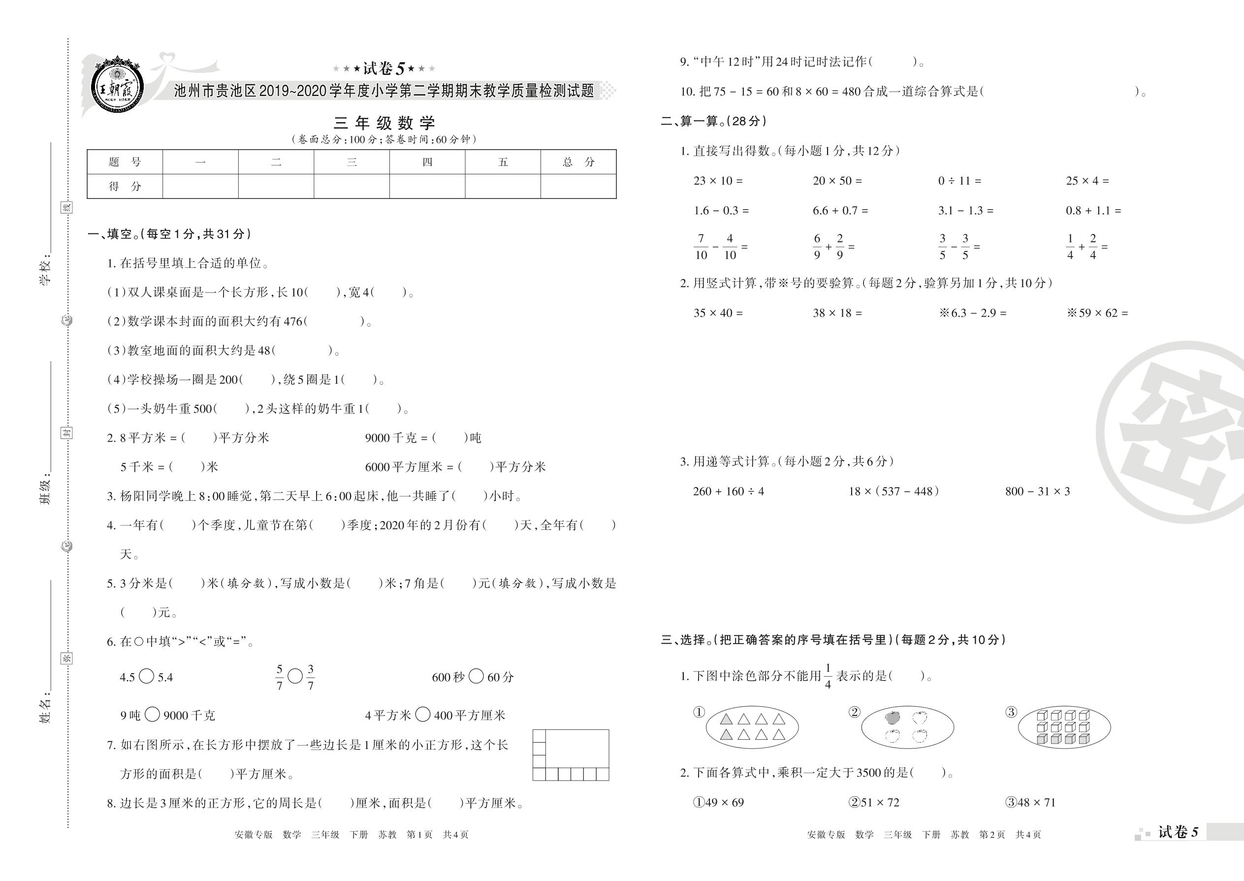 2019-2020学年第二学期池州市贵池区三年级数学试卷(苏教版)【5】