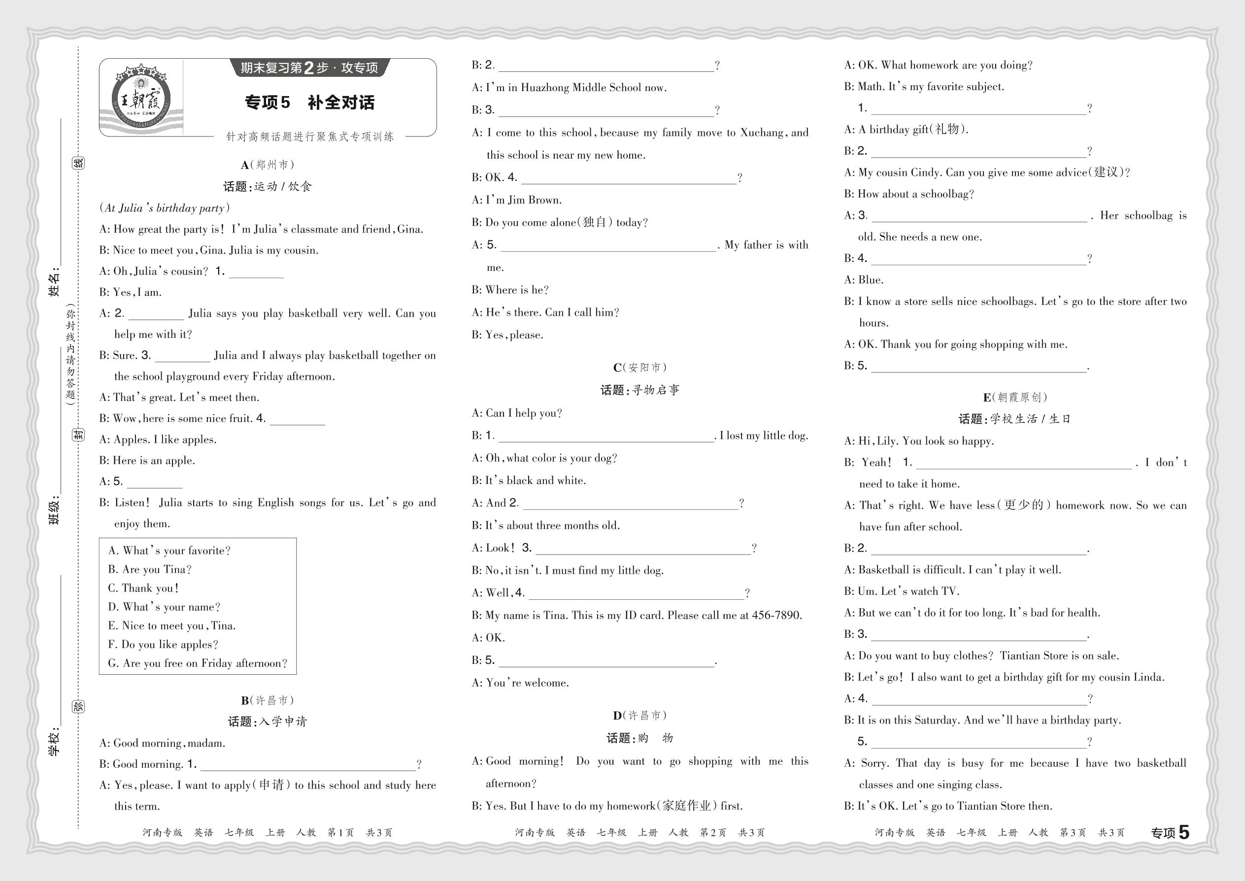 2023秋上册七年级英语人教版 期末专项卷·补全对话【5】