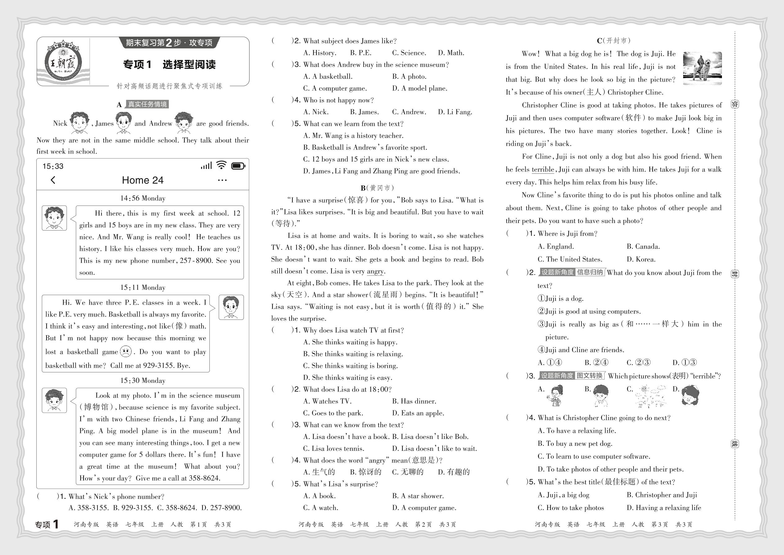 2023秋上册七年级英语人教版 期末专项卷·选择型阅读【1】