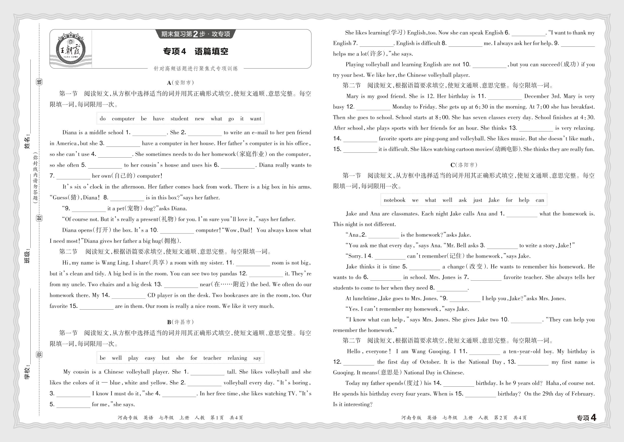 2023秋上册七年级英语人教版 期末专项卷·语篇填空【4】