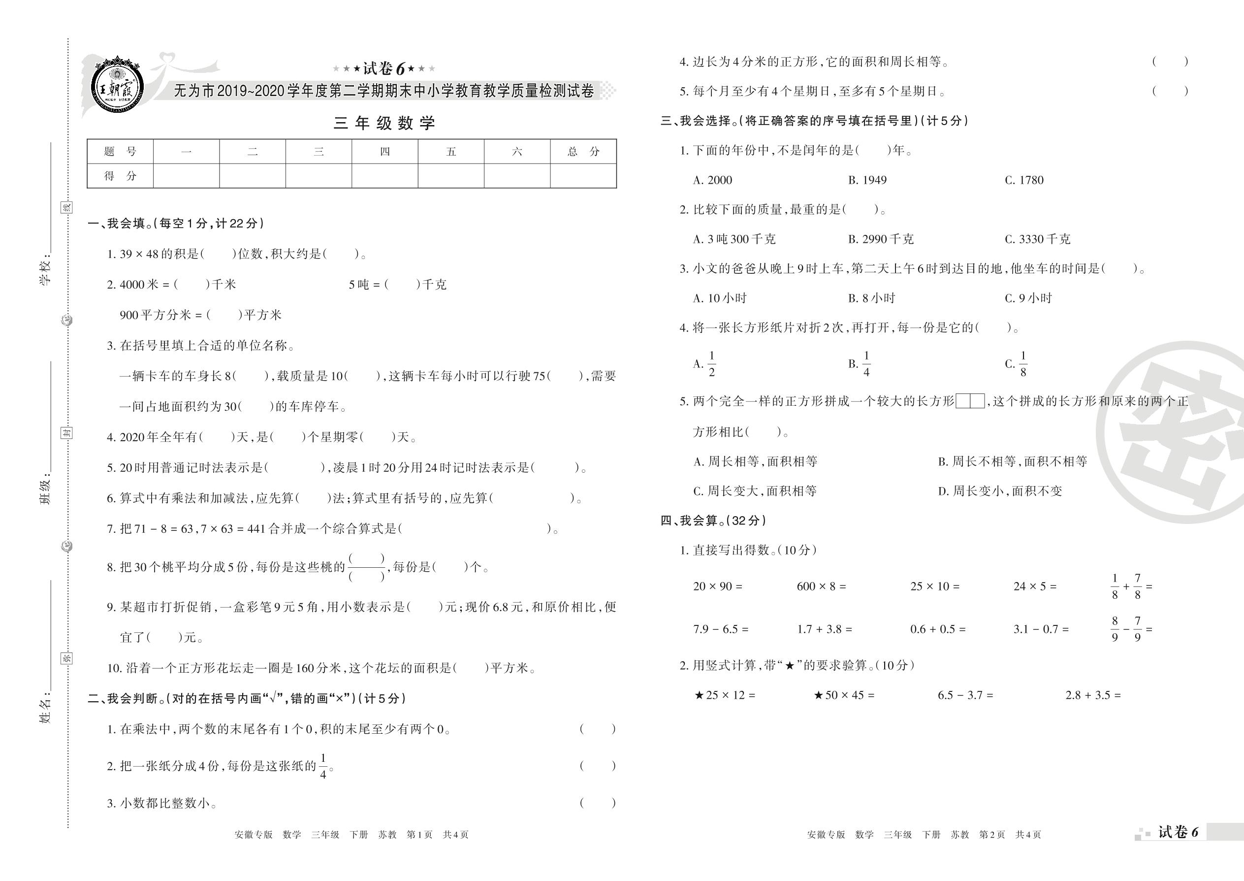 2019-2020学年第二学期无为市三年级数学试卷(苏教版)【6】