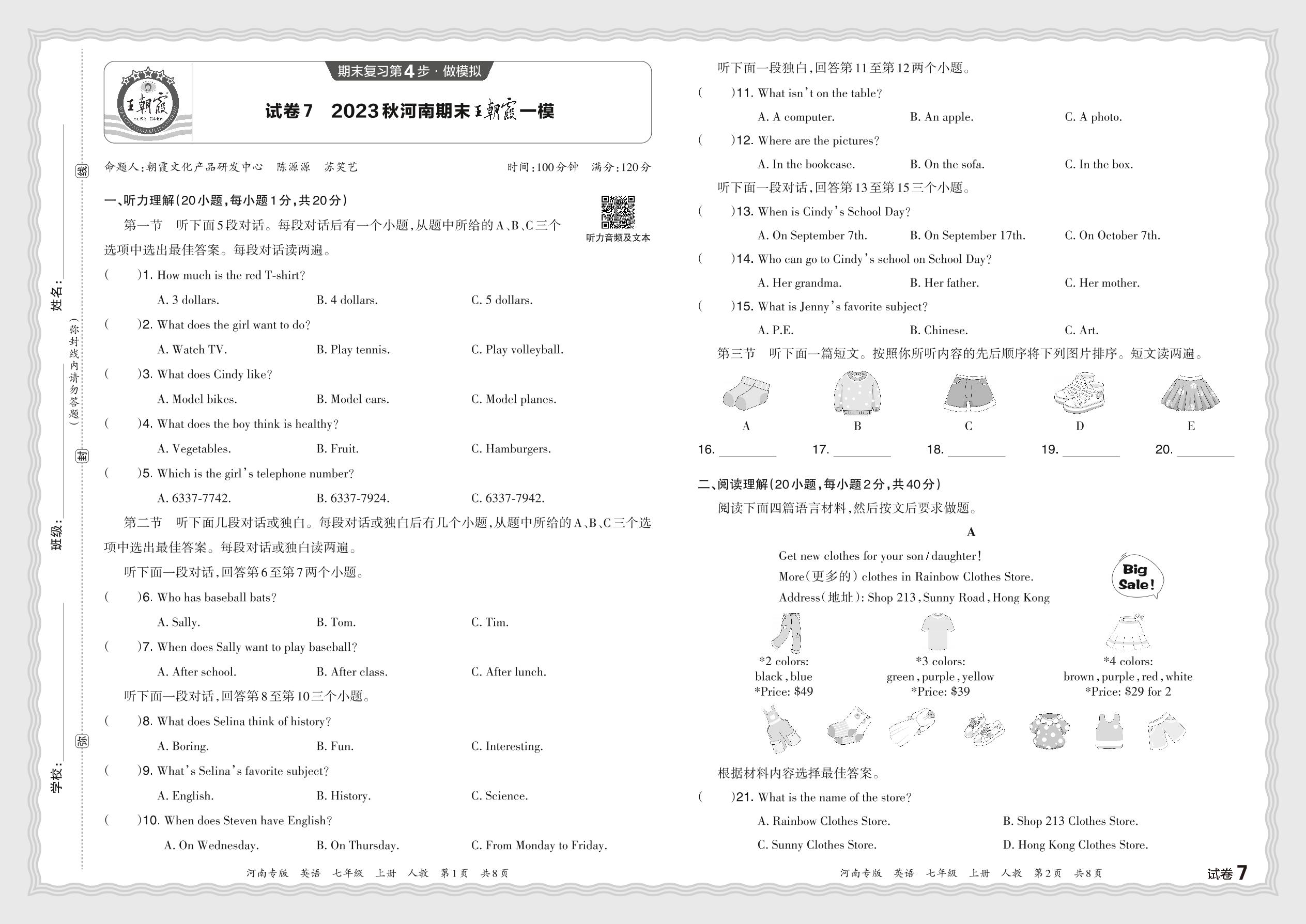 2023秋上册七年级英语人教版 河南期末王朝霞一模
