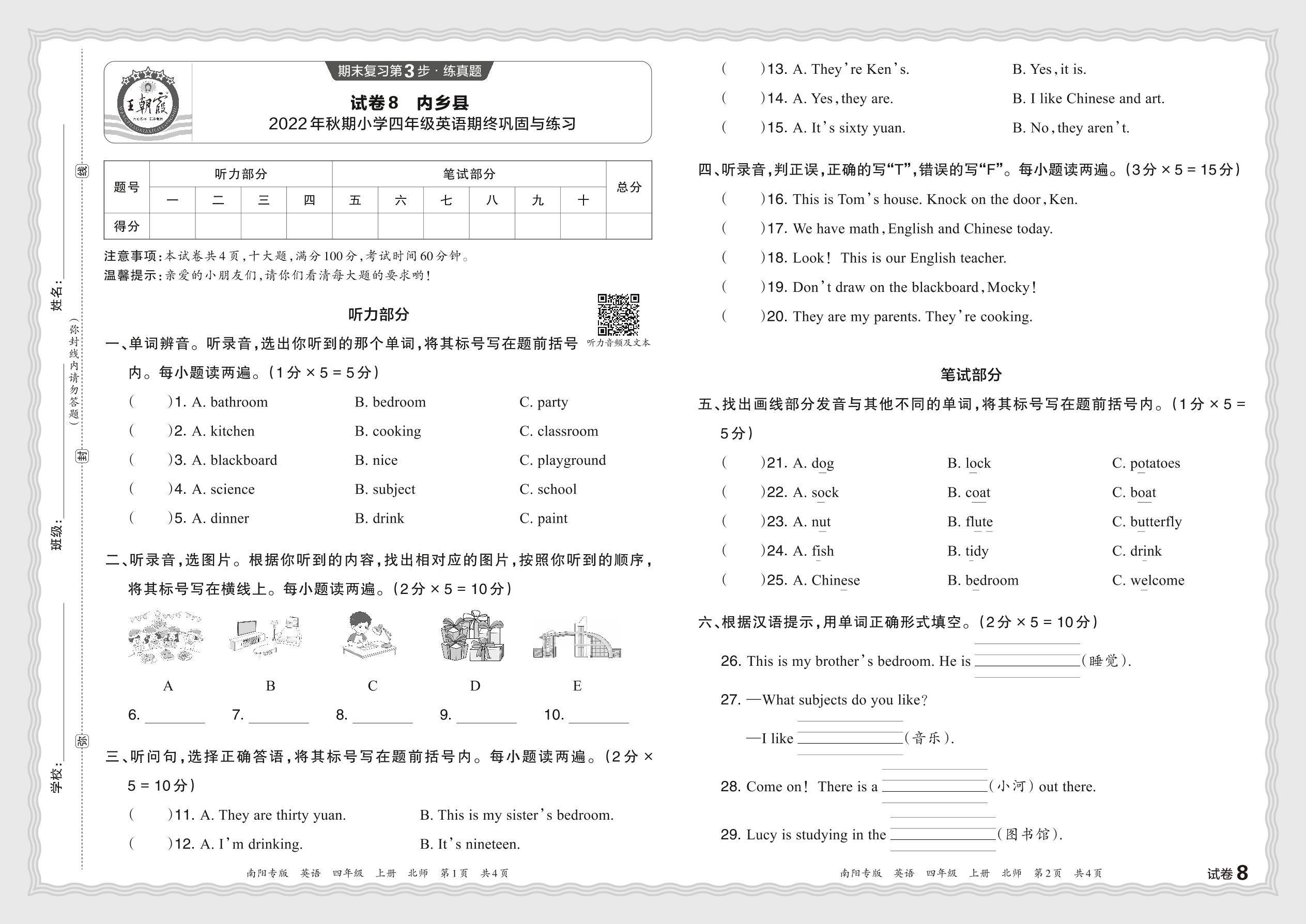 河南省南阳市内乡县2022年秋期小学四年级英语期终巩固与练习(北师版)【8】