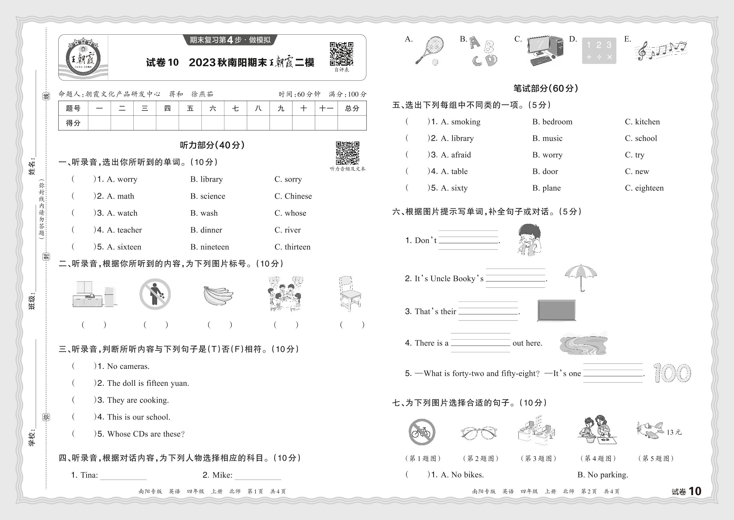 2023秋上册四年级英语北师版 河南南阳期末王朝霞二模【10】