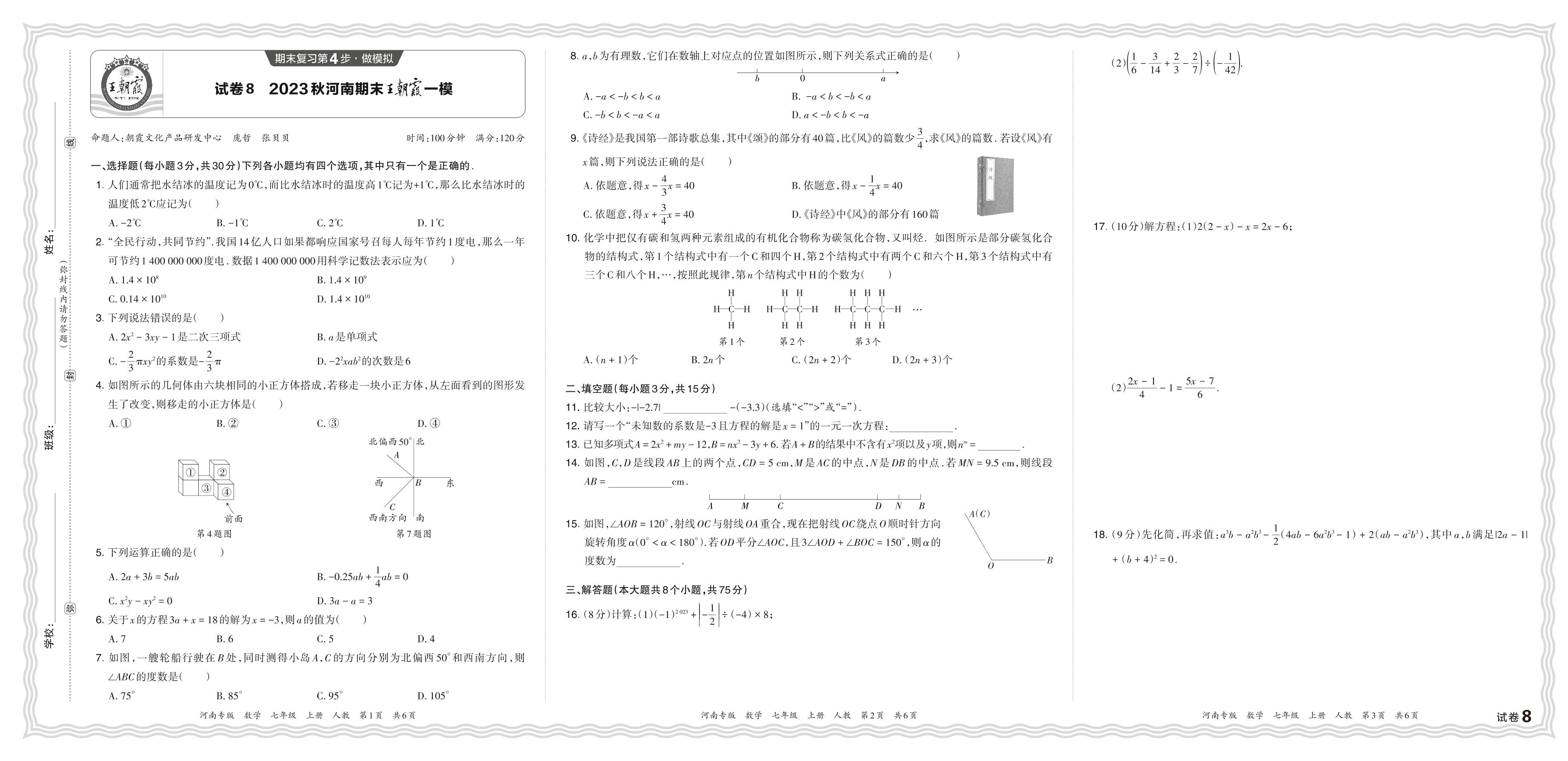 2023秋上册七年级数学人教版 河南期末王朝霞一模