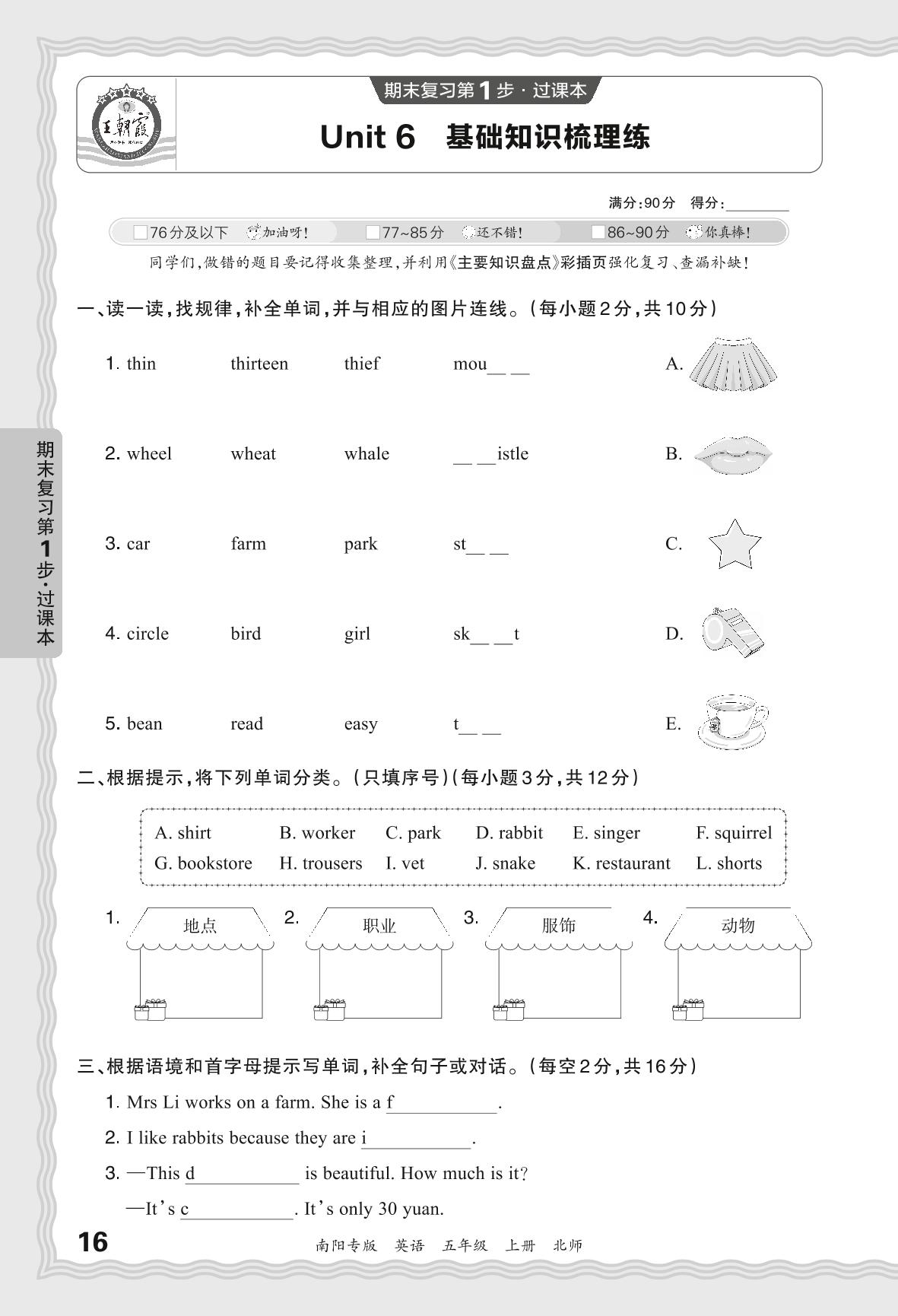 2023秋上册五年级英语北师版 期末过课本·Unit 6 基础知识梳理练
