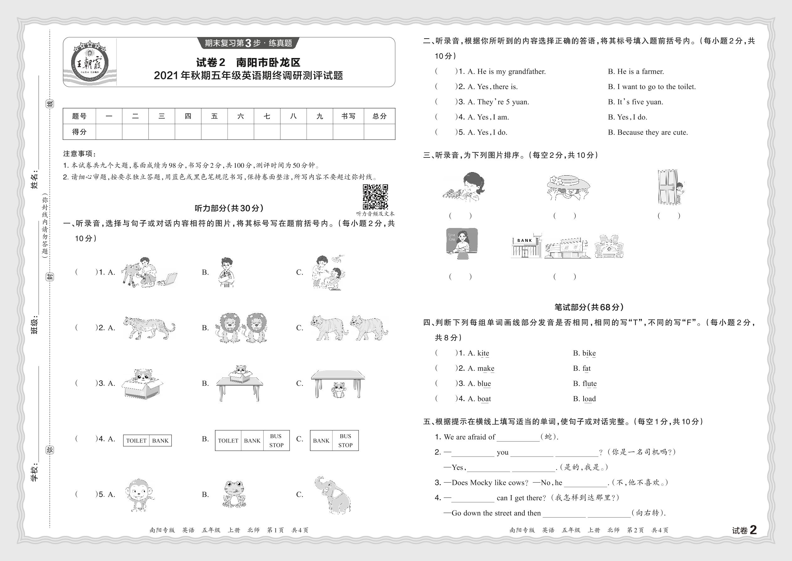 河南省南阳市卧龙区2021年秋期五年级英语期终调研测评试题(北师版)【2】