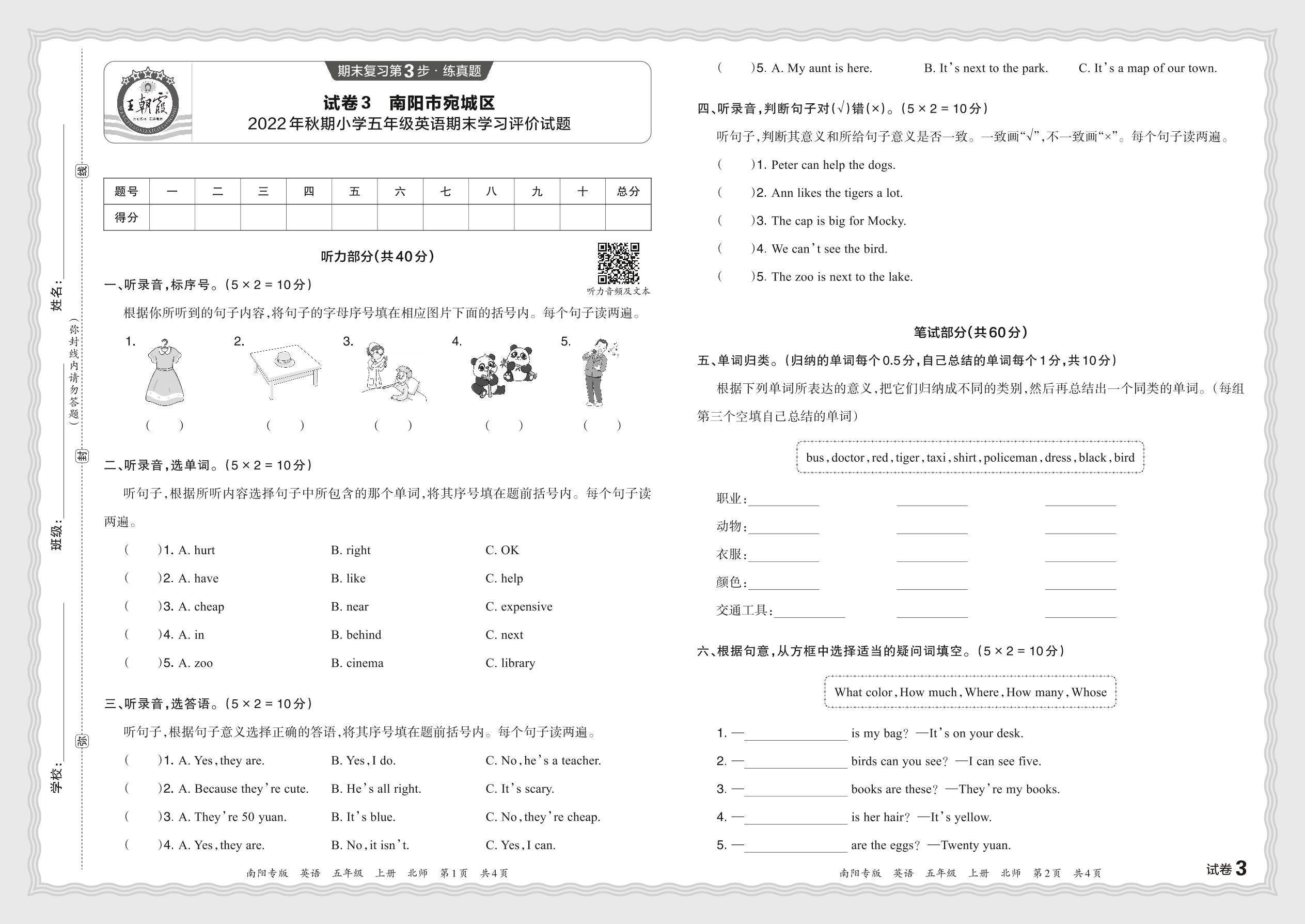 河南省南阳市宛城区2022年秋期小学五年级英语期末学习评价试题(北师版)【3】
