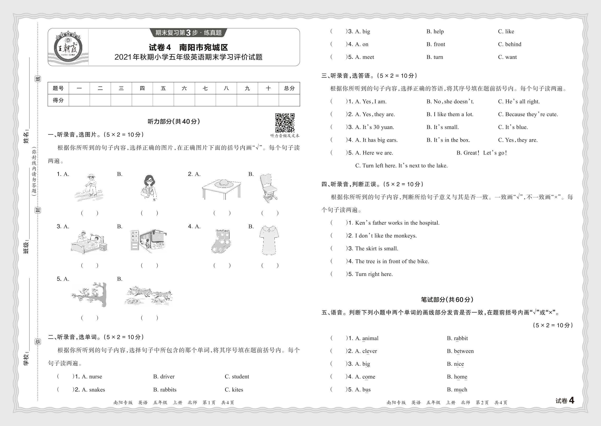 河南省南阳市宛城区2021年秋期小学五年级英语期末学习评价试题(北师版)【4】
