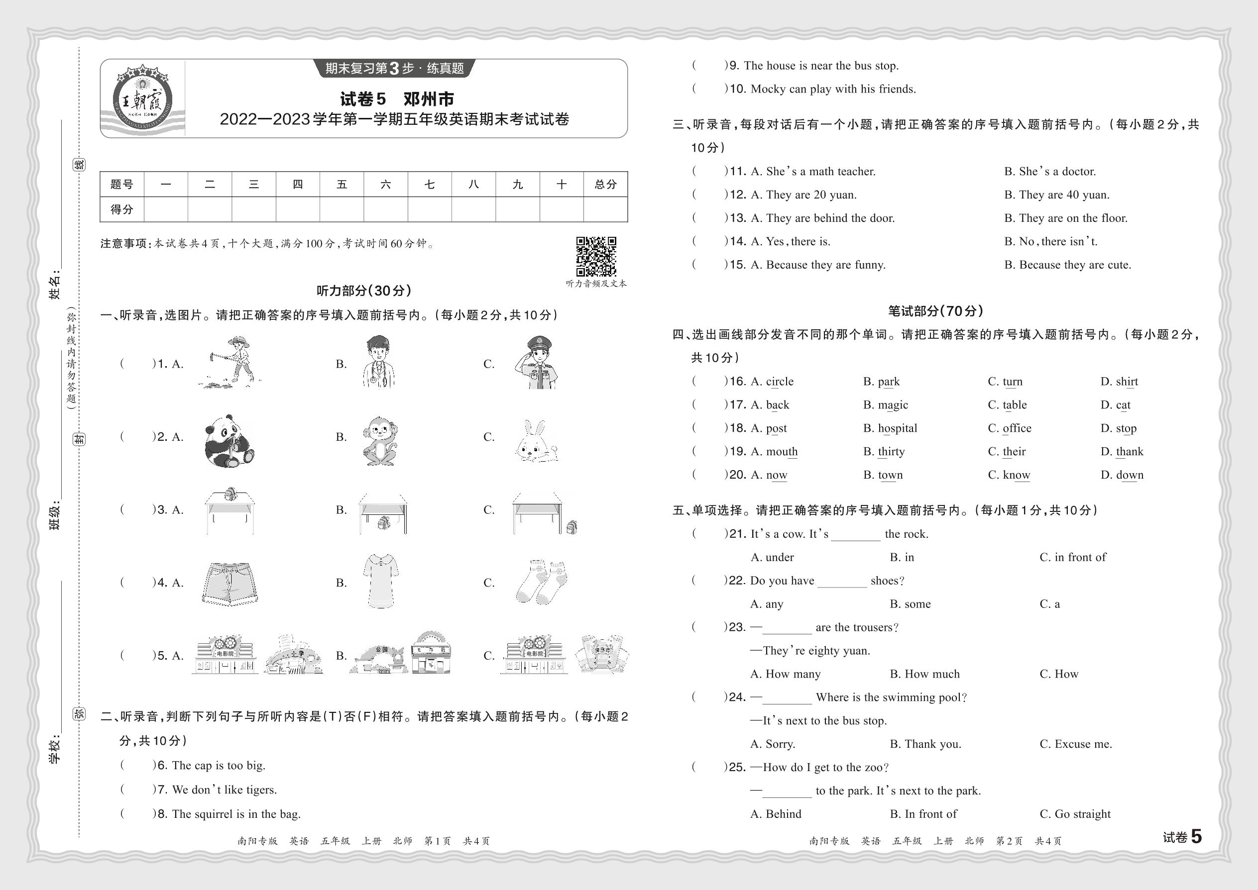 河南省南阳市邓州市2022—2023学年第一学期五年级英语期末考试试卷(北师版)【5】