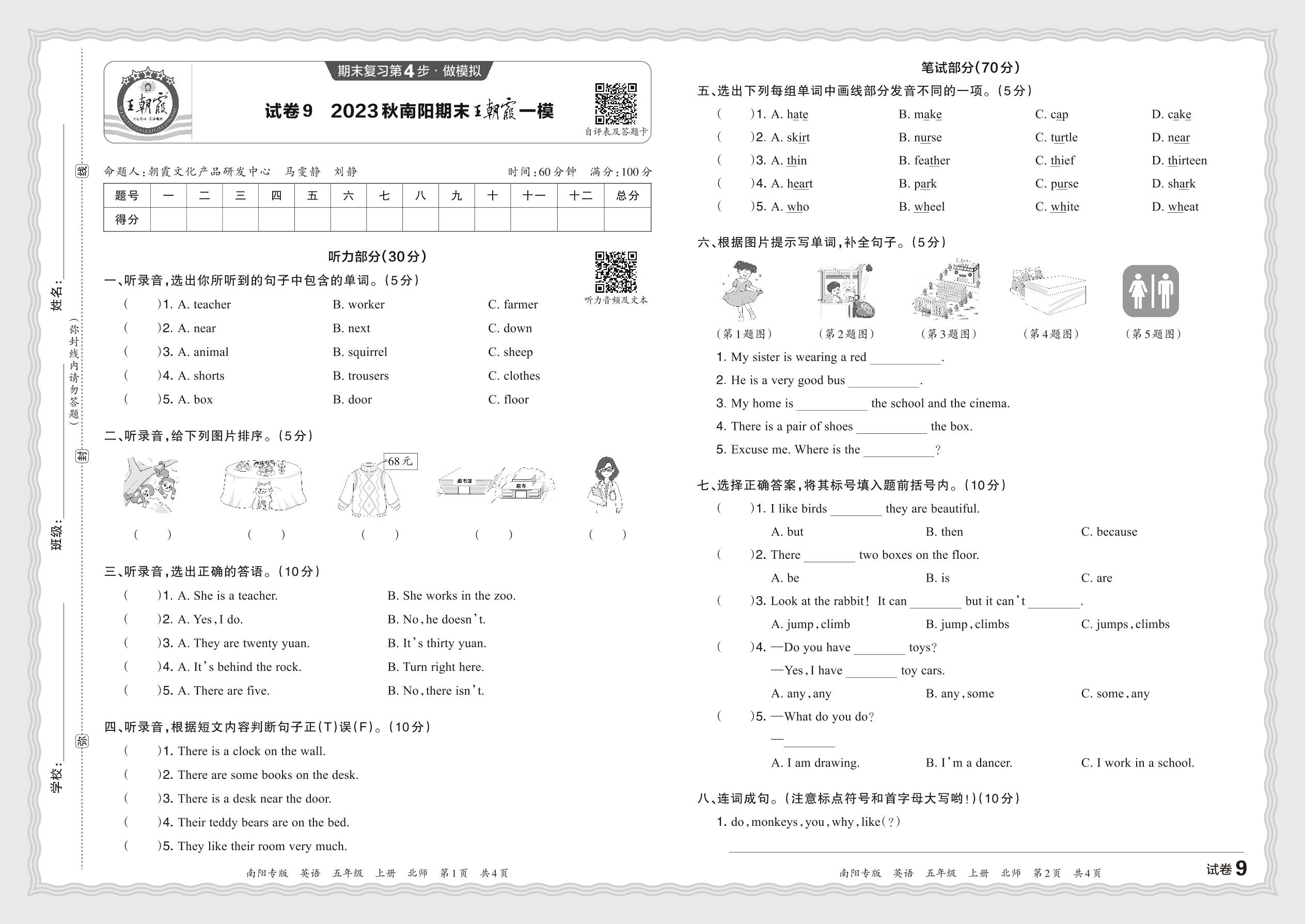 2023秋上册五年级英语北师版 河南南阳期末王朝霞一模【9】