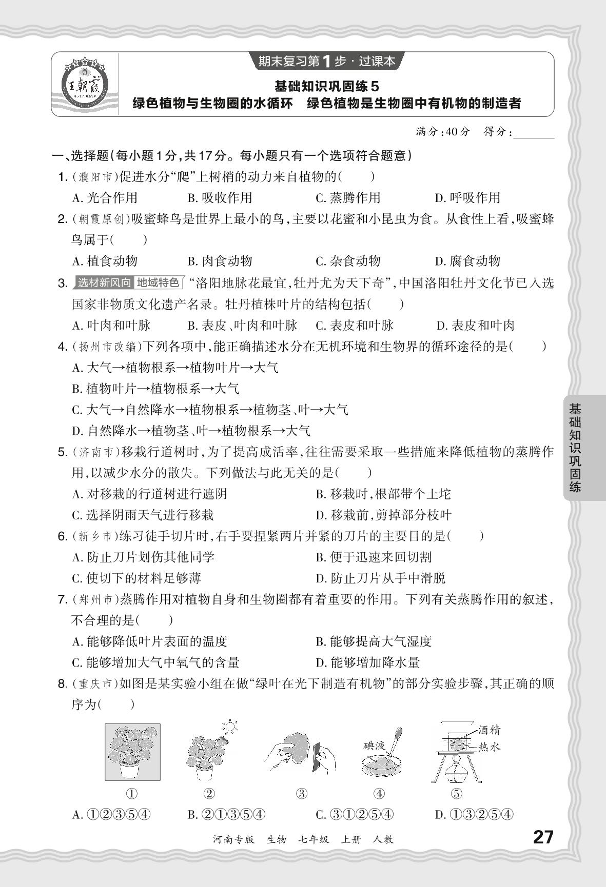 2023秋上册七年级生物人教版 期末过课本·基础知识巩固练 绿色植物与生物圈的水循环 绿色植物是生物圈中有机物的制造者【5】