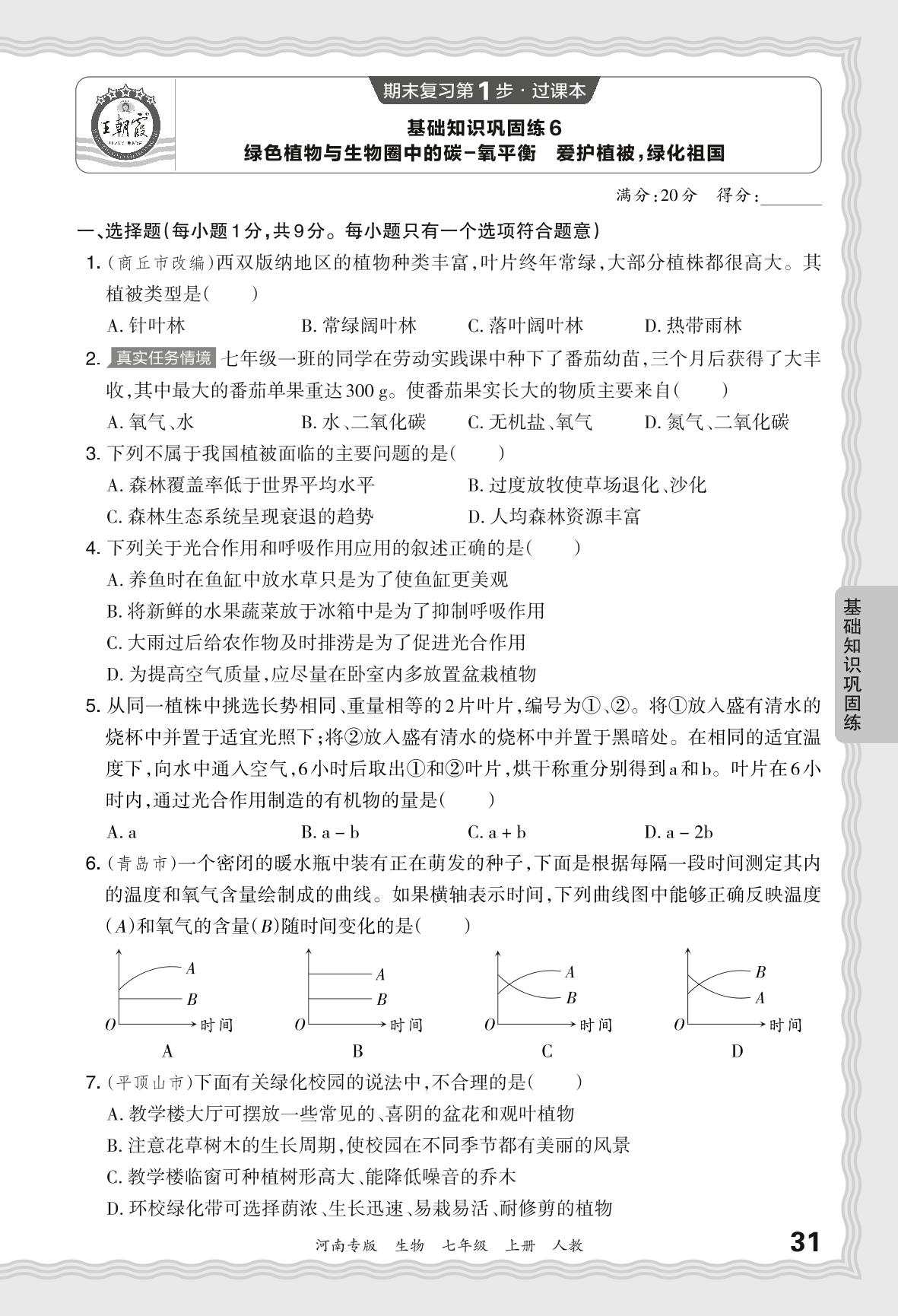 2023秋上册七年级生物人教版 期末过课本·基础知识巩固练 绿色植物与生物圈中的碳-氧平衡 爱护植被,绿化祖国【6】