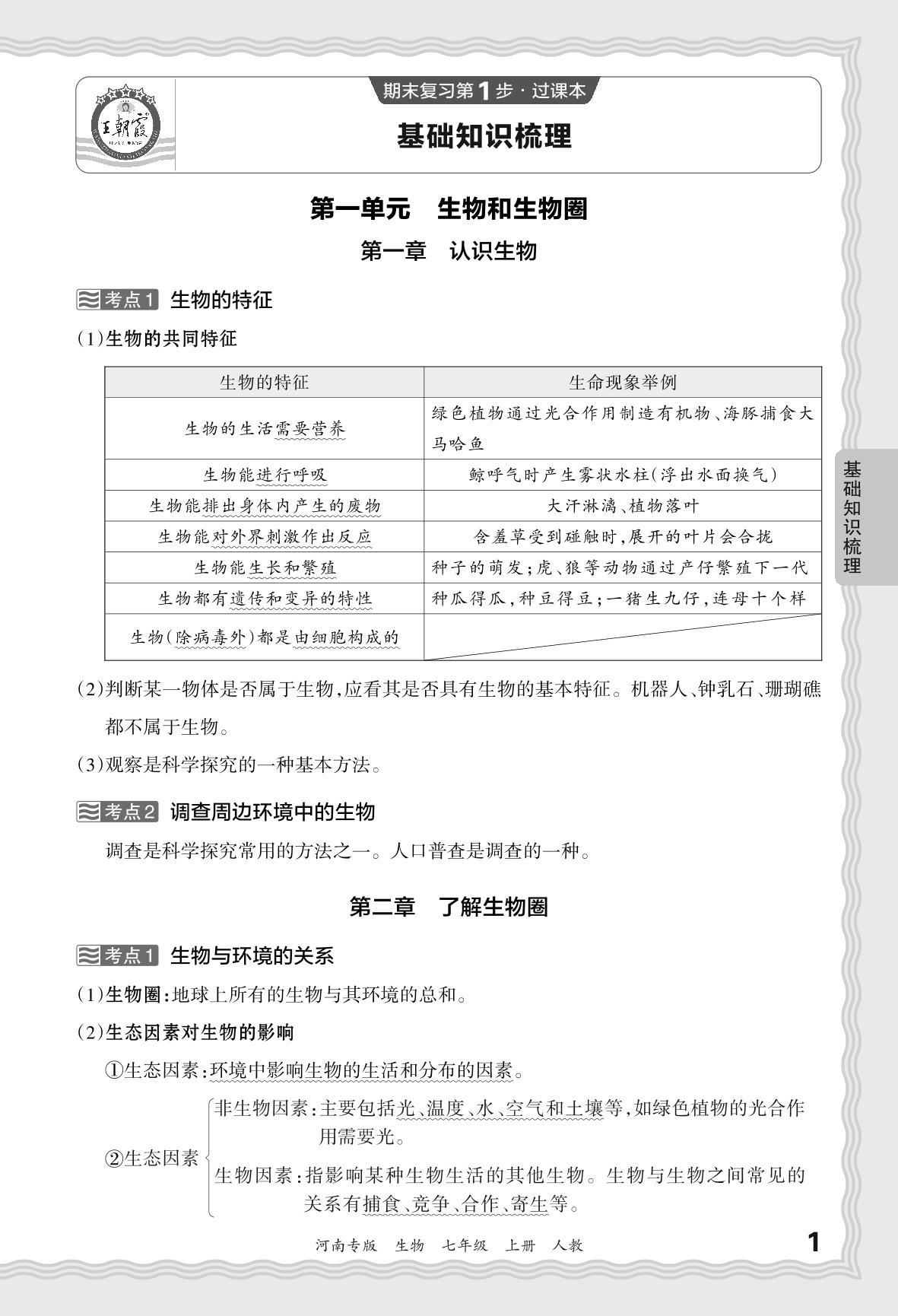 2023秋上册七年级生物人教版 期末过课本·基础知识梳理 第一单元 生物和生物圈