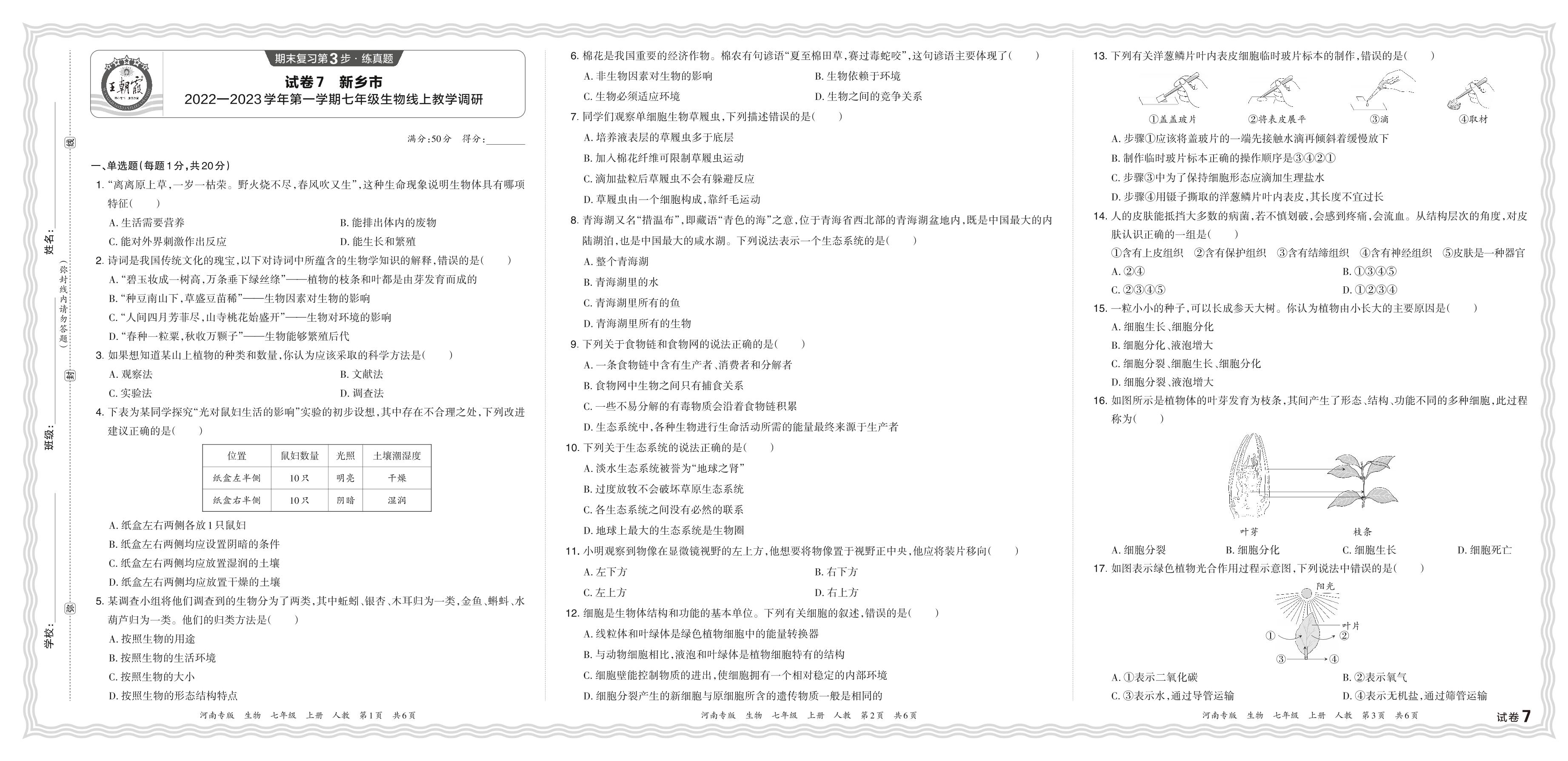 河南省新乡市2022—2023学年第一学期七年级生物线上教学调研(人教版)【7】