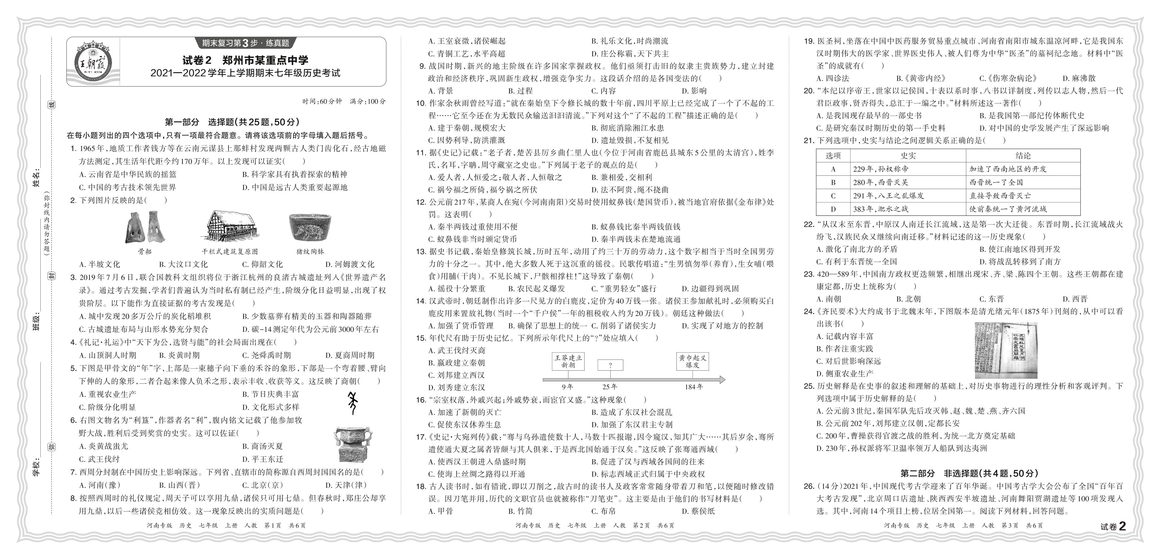 河南省郑州市某重点中学2021—2022学年上学期期末七年级历史考试(人教版)【2】