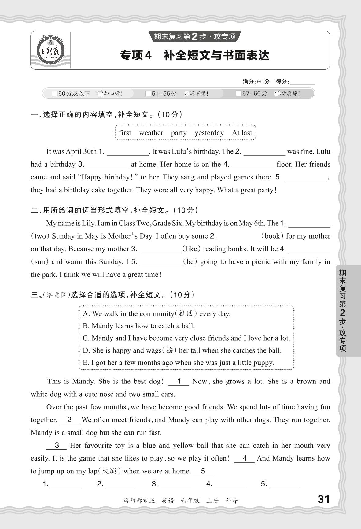 2023秋上册六年级英语科普版 期末专项卷·补全短文与书面表达【4】