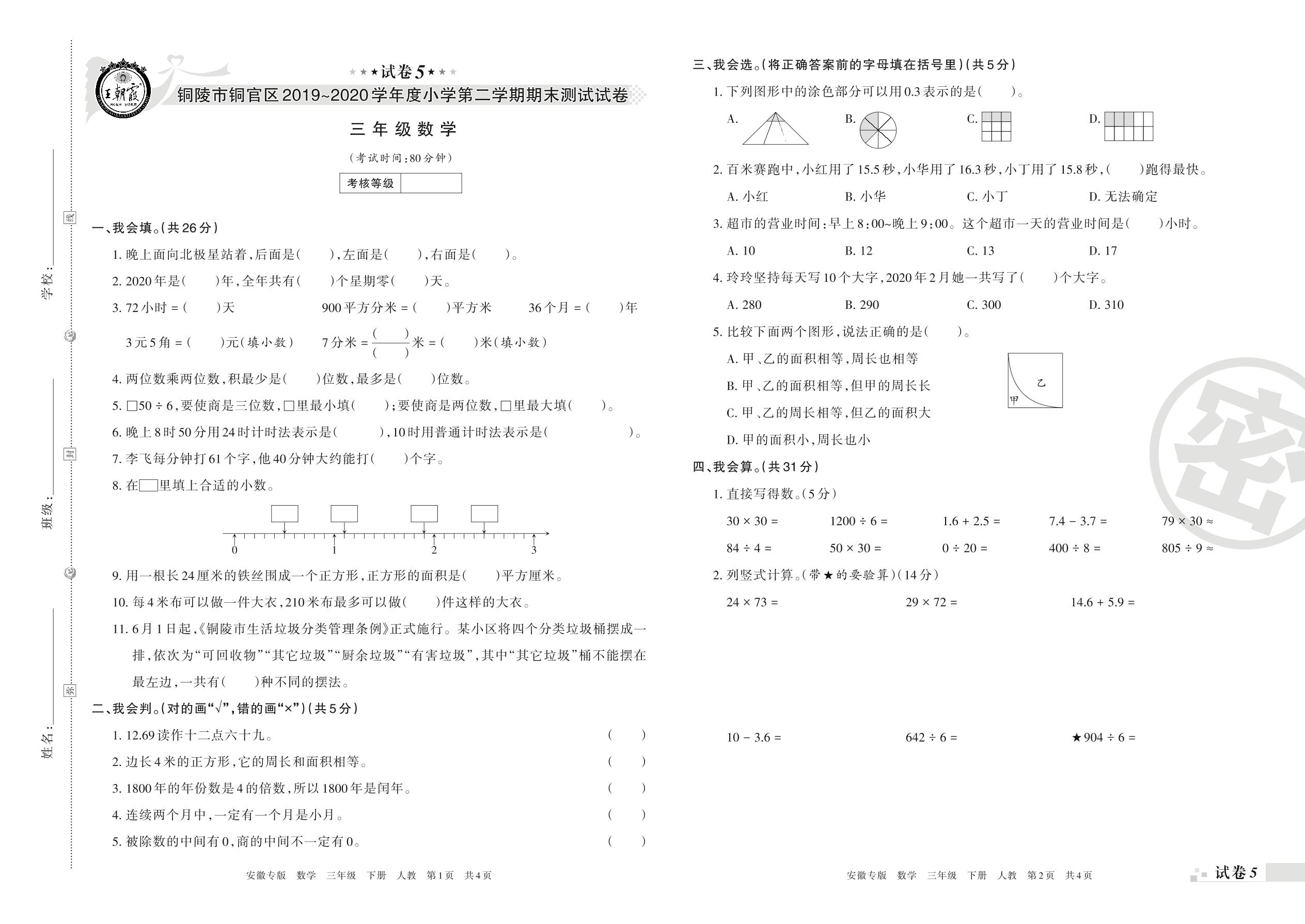 2019-2020学年第二学期铜陵市铜官区三年级数学试卷(人教版)【5】