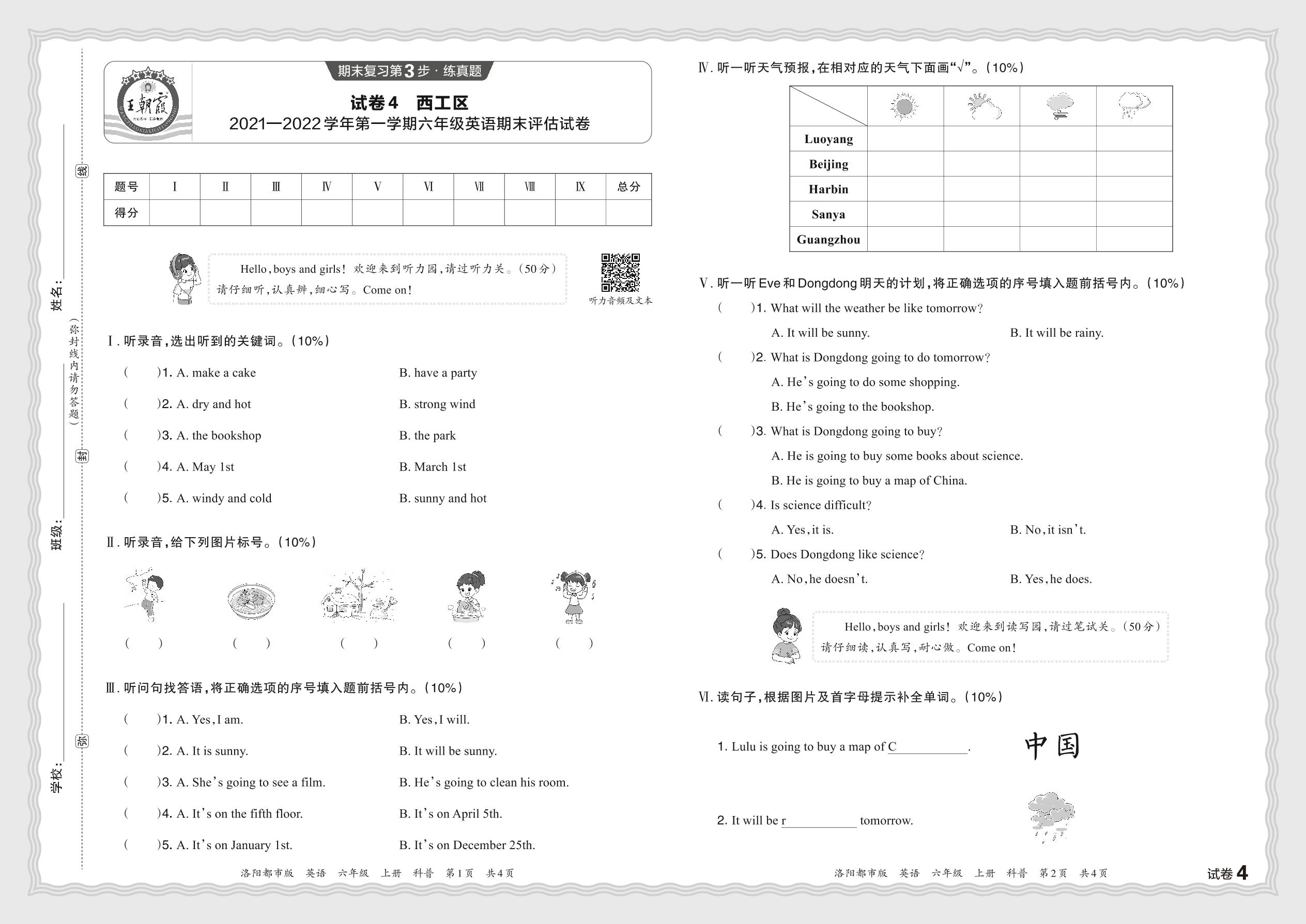河南省洛阳市西工区2021—2022学年第一学期六年级英语期末评估试卷【4】
