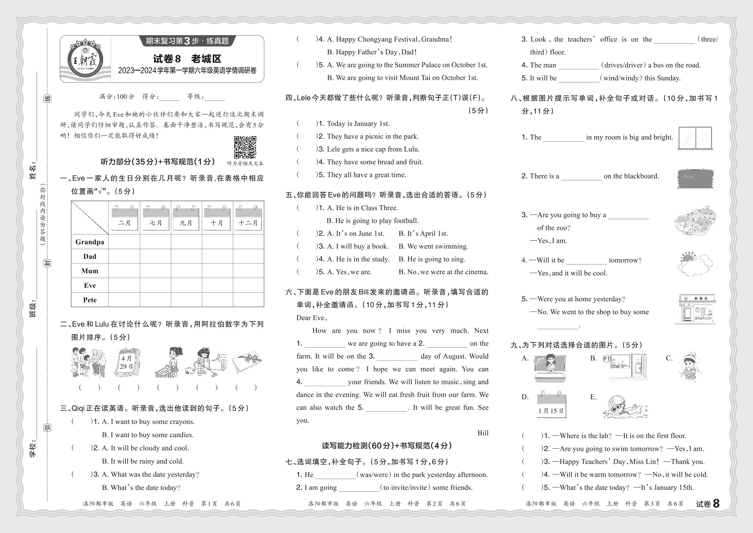 河南省洛阳市老城区2023—2024学年第一学期六年级英语学情调研卷(科普版)【8】