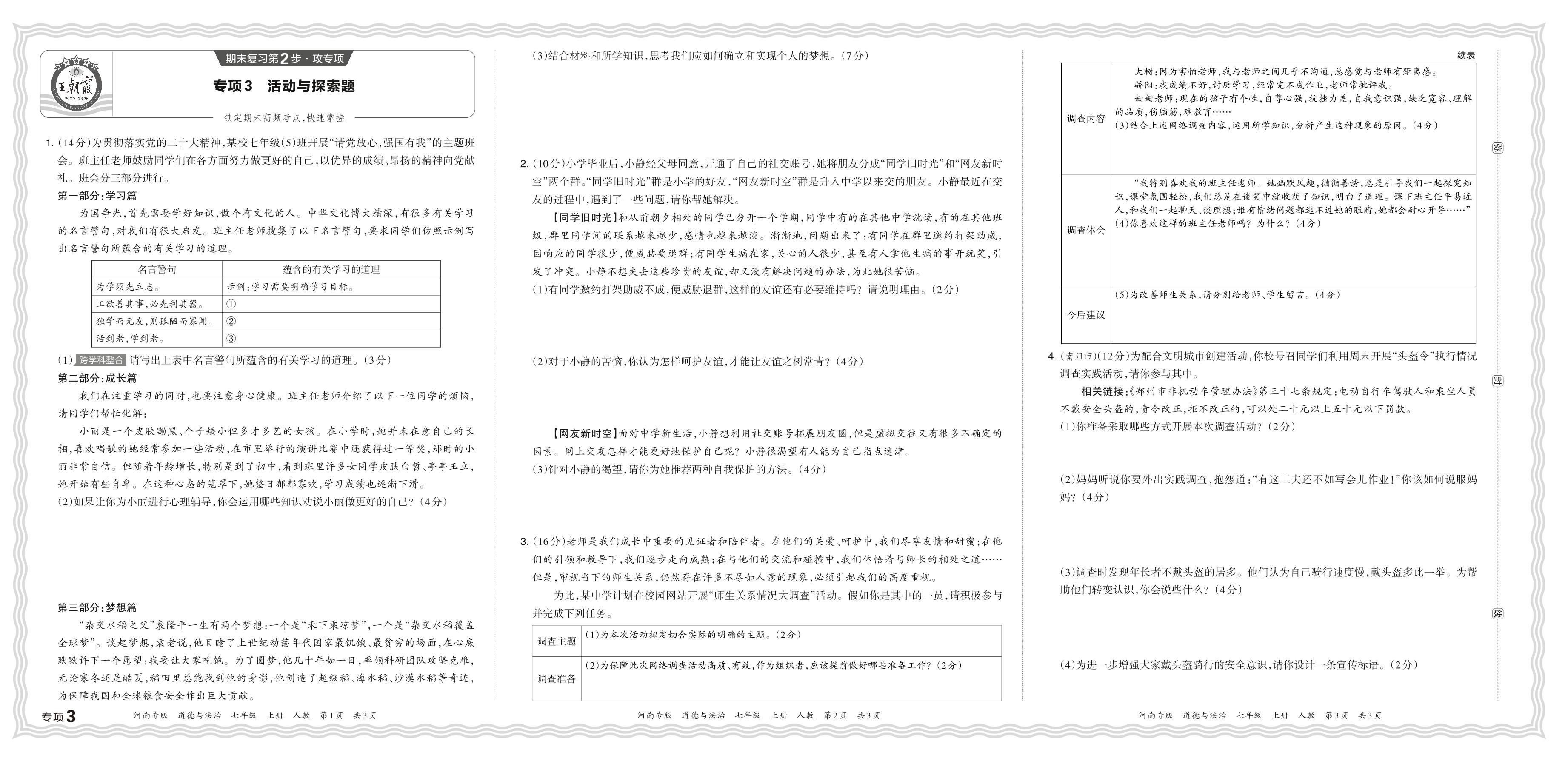 2023秋上册七年级道德与法治人教版 期末专项卷·活动与探索题【3】