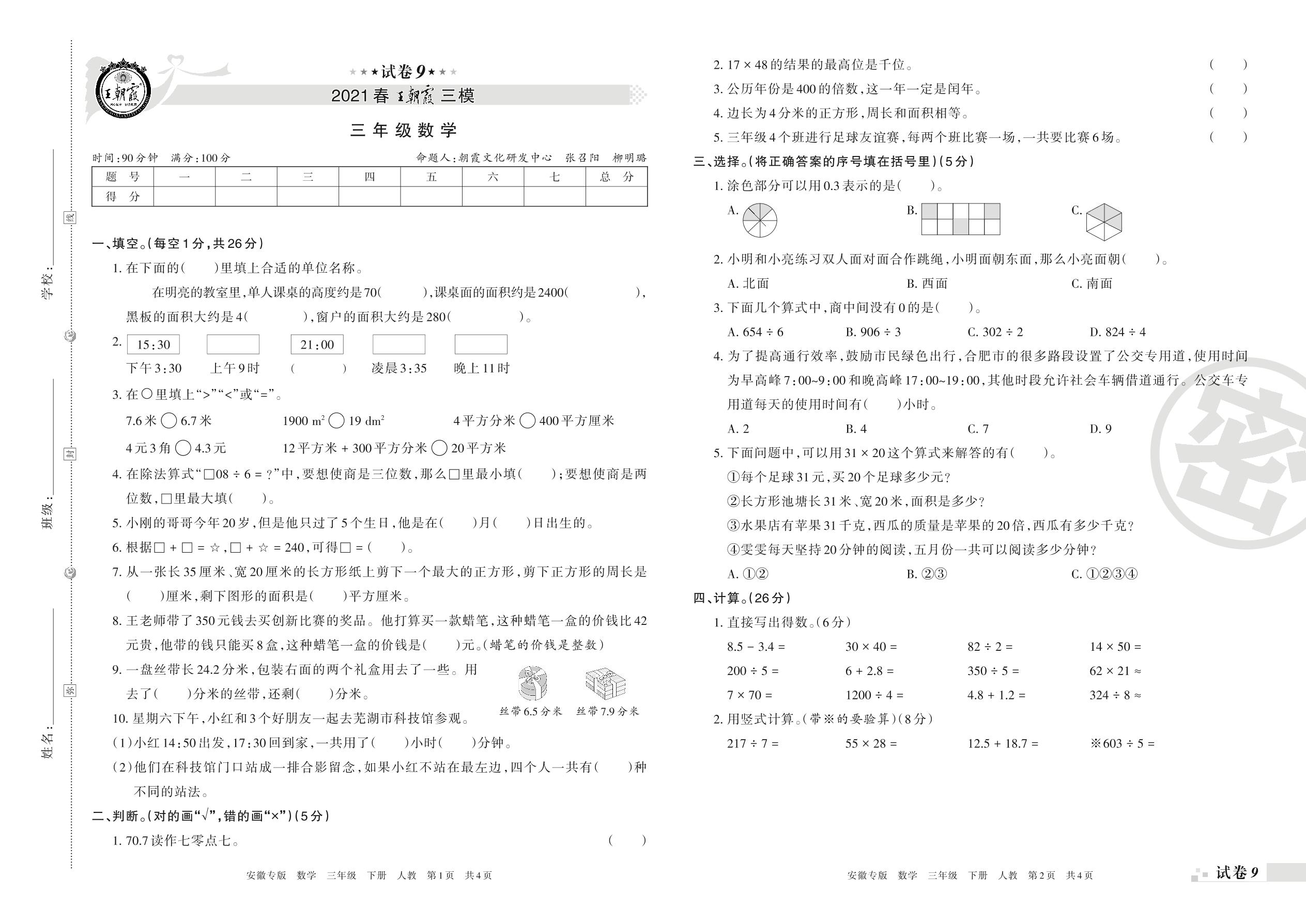 王朝霞期末模拟卷三年级下册数学(人教版)_R21080485248【9】