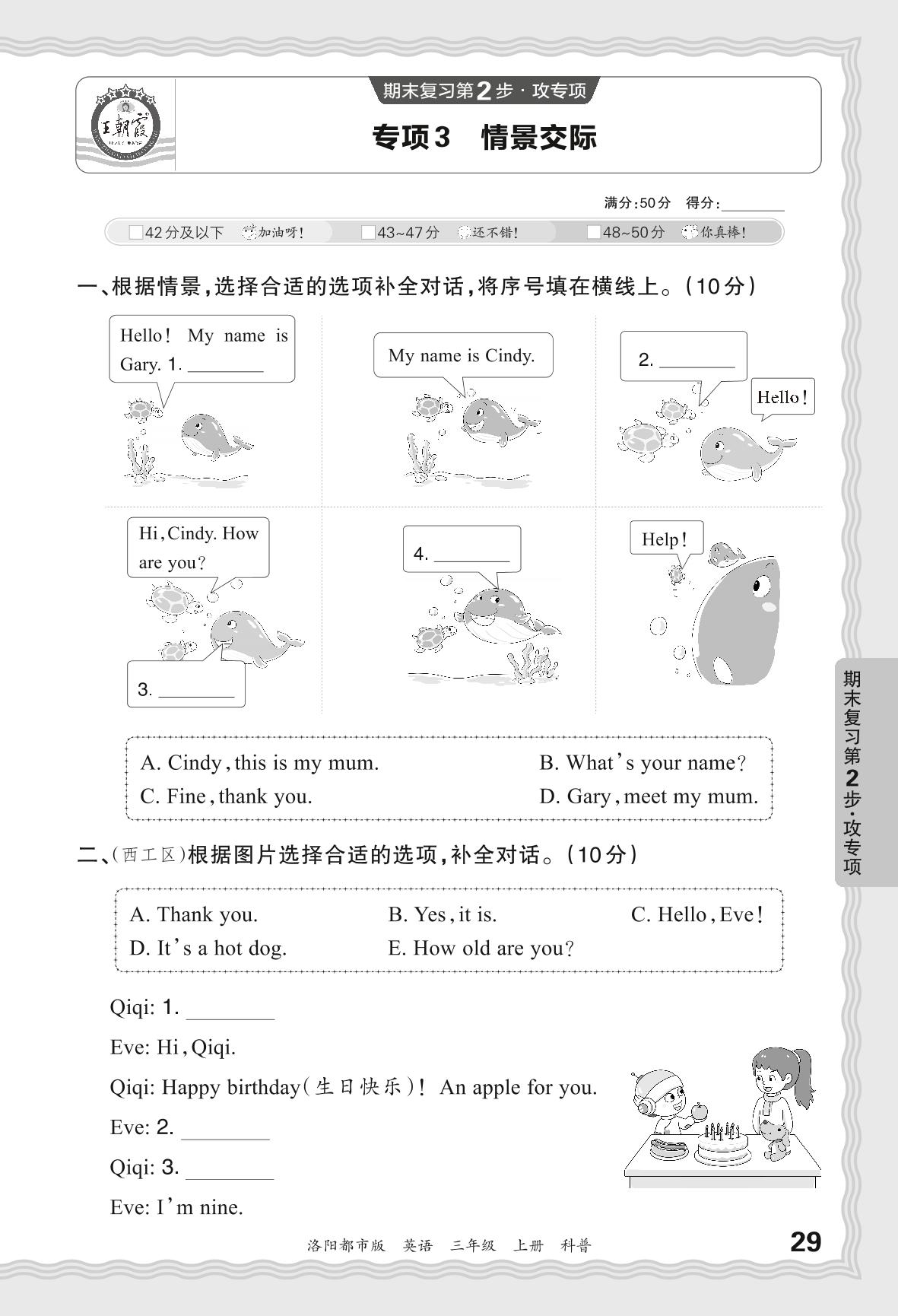 2023秋上册三年级英语科普版 期末专项卷·情景交际【3】