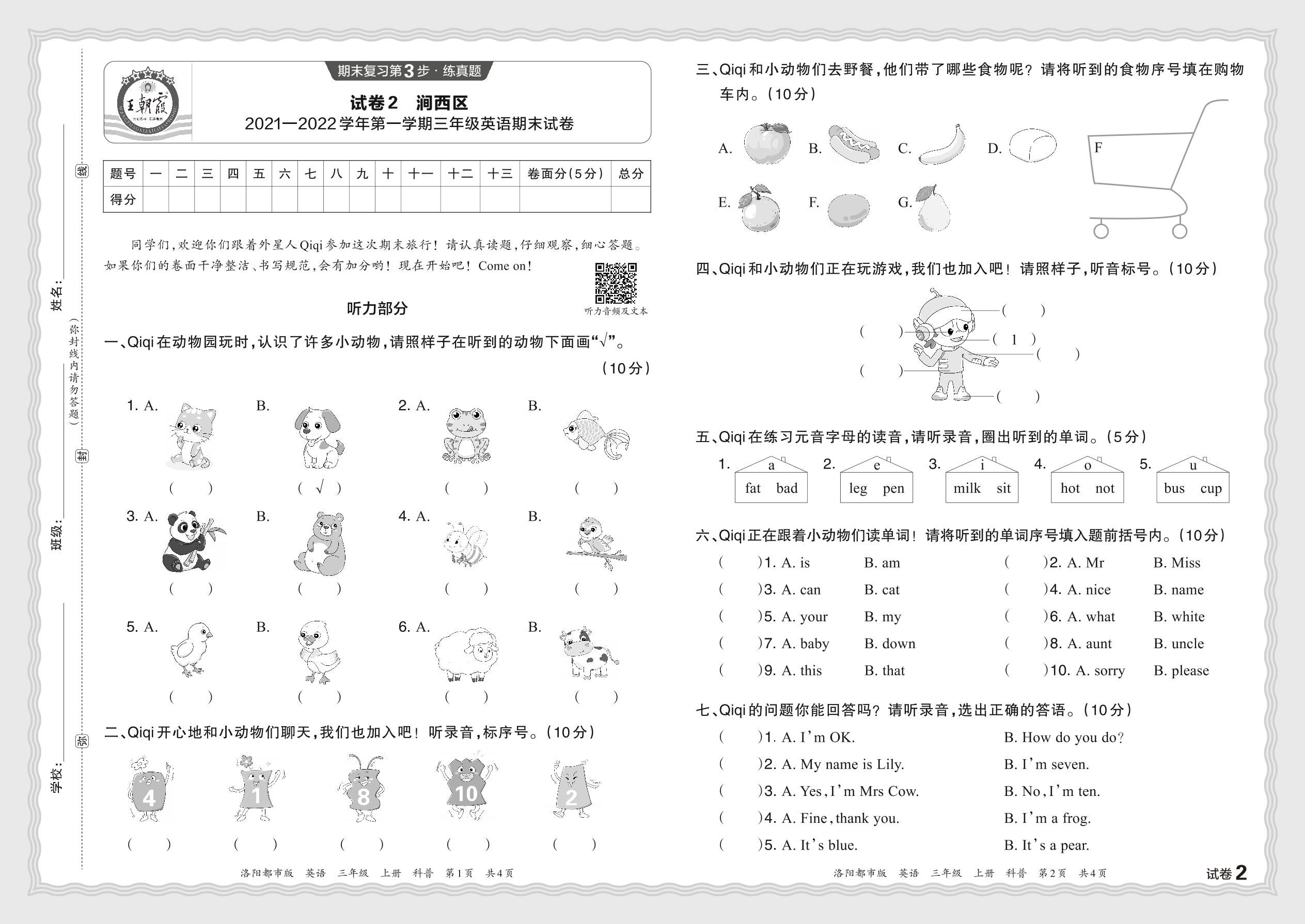 河南省洛阳市涧西区2021—2022学年第一学期三年级英语期末试卷【2】