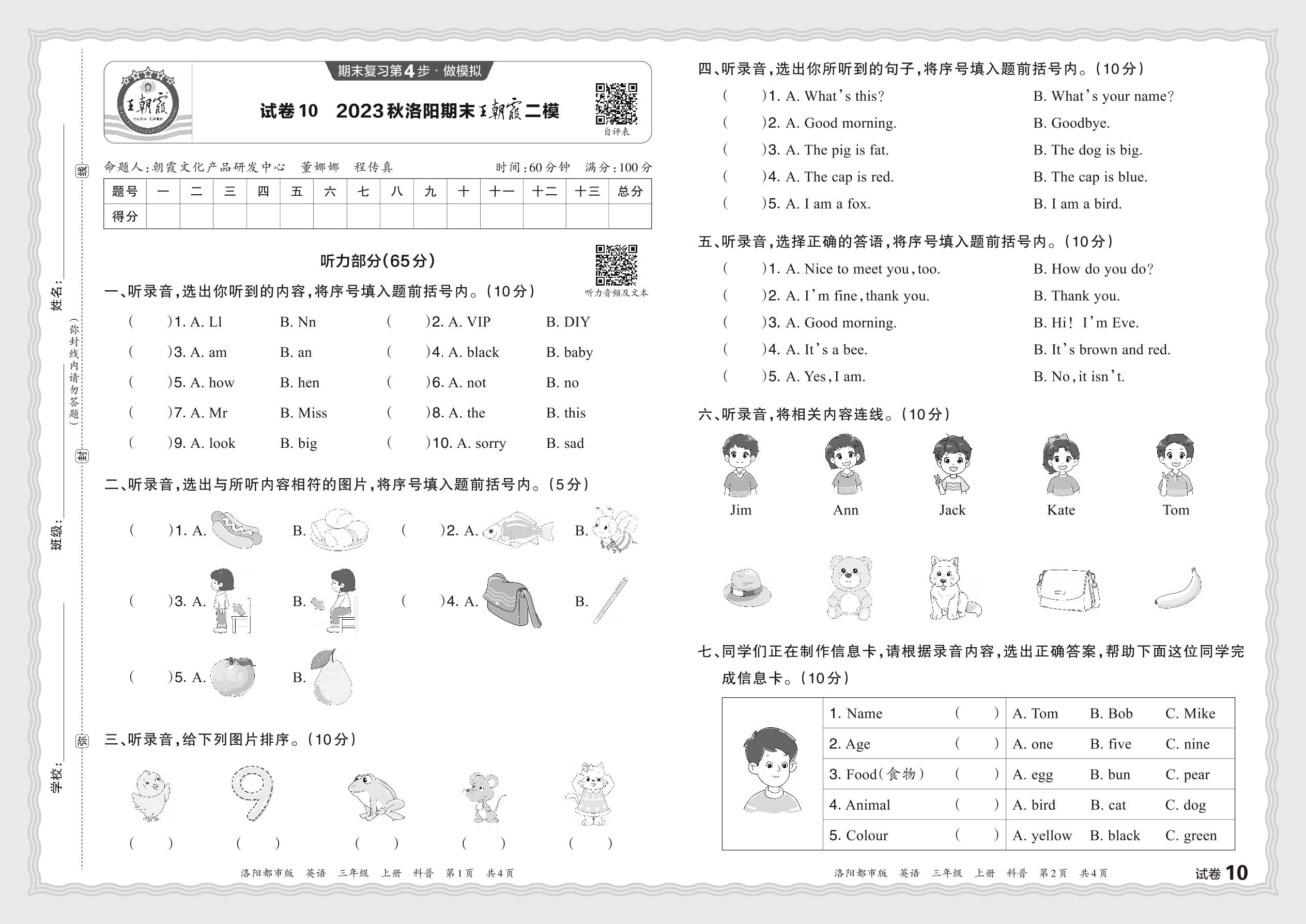 2023秋上册三年级英语科普版 河南洛阳期末王朝霞二模【10】