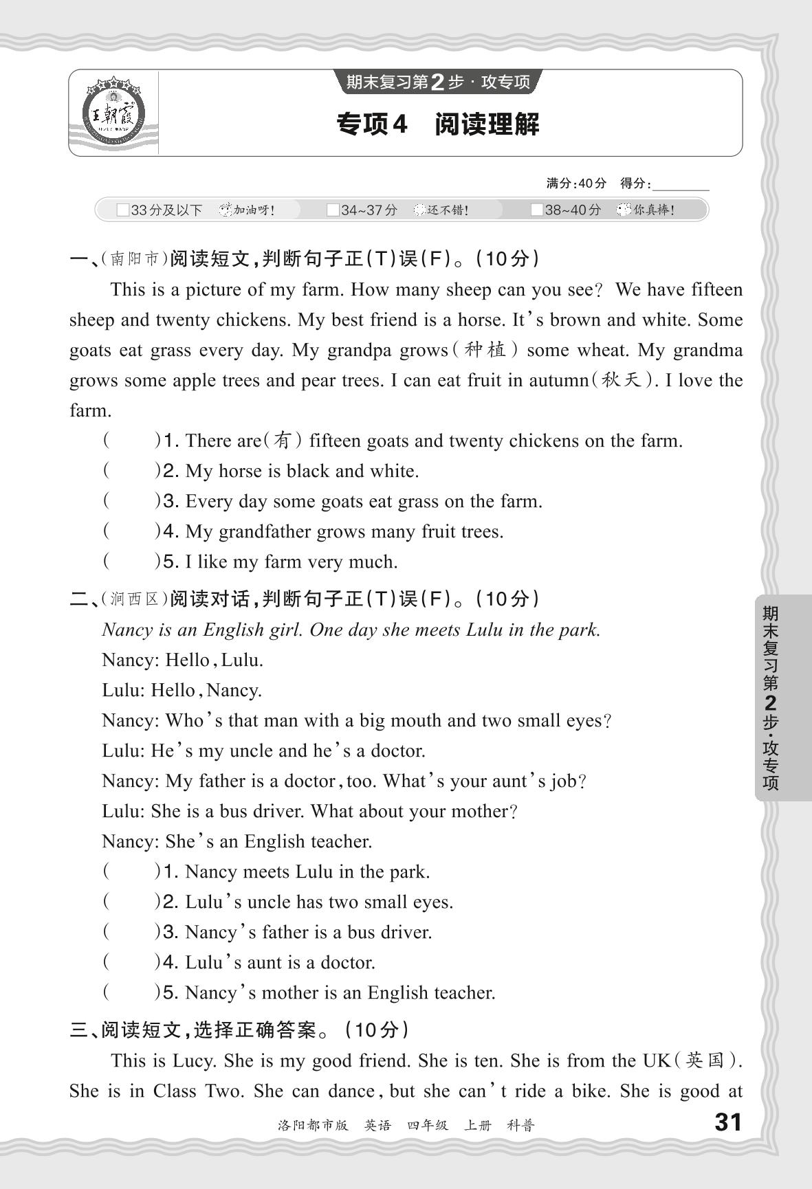 2023秋上册四年级英语科普版 期末专项卷·阅读理解_R231127105345806【4】