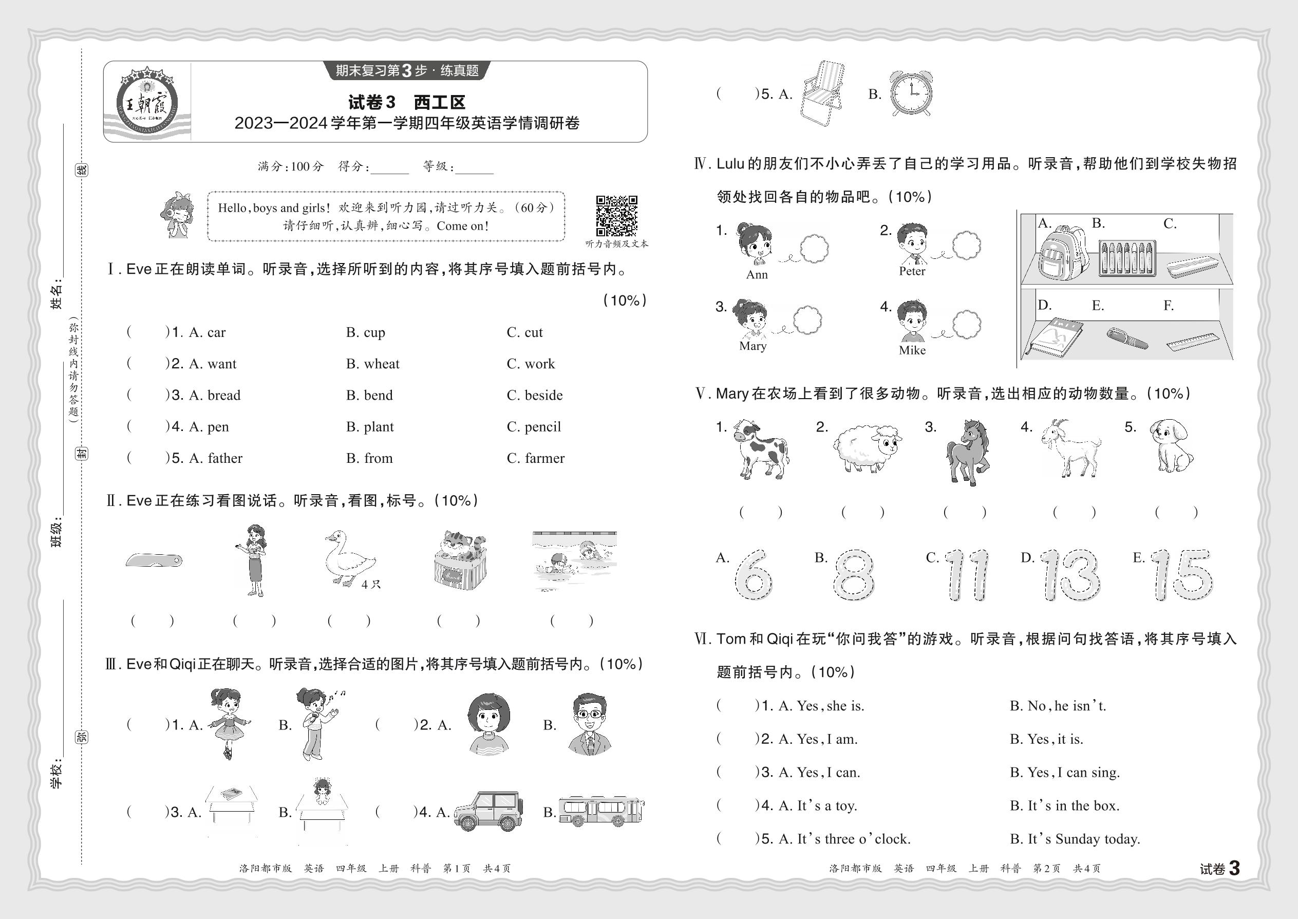 河南省洛阳市西工区2023—2024学年第一学期四年级英语学情调研卷(科普版)【3】