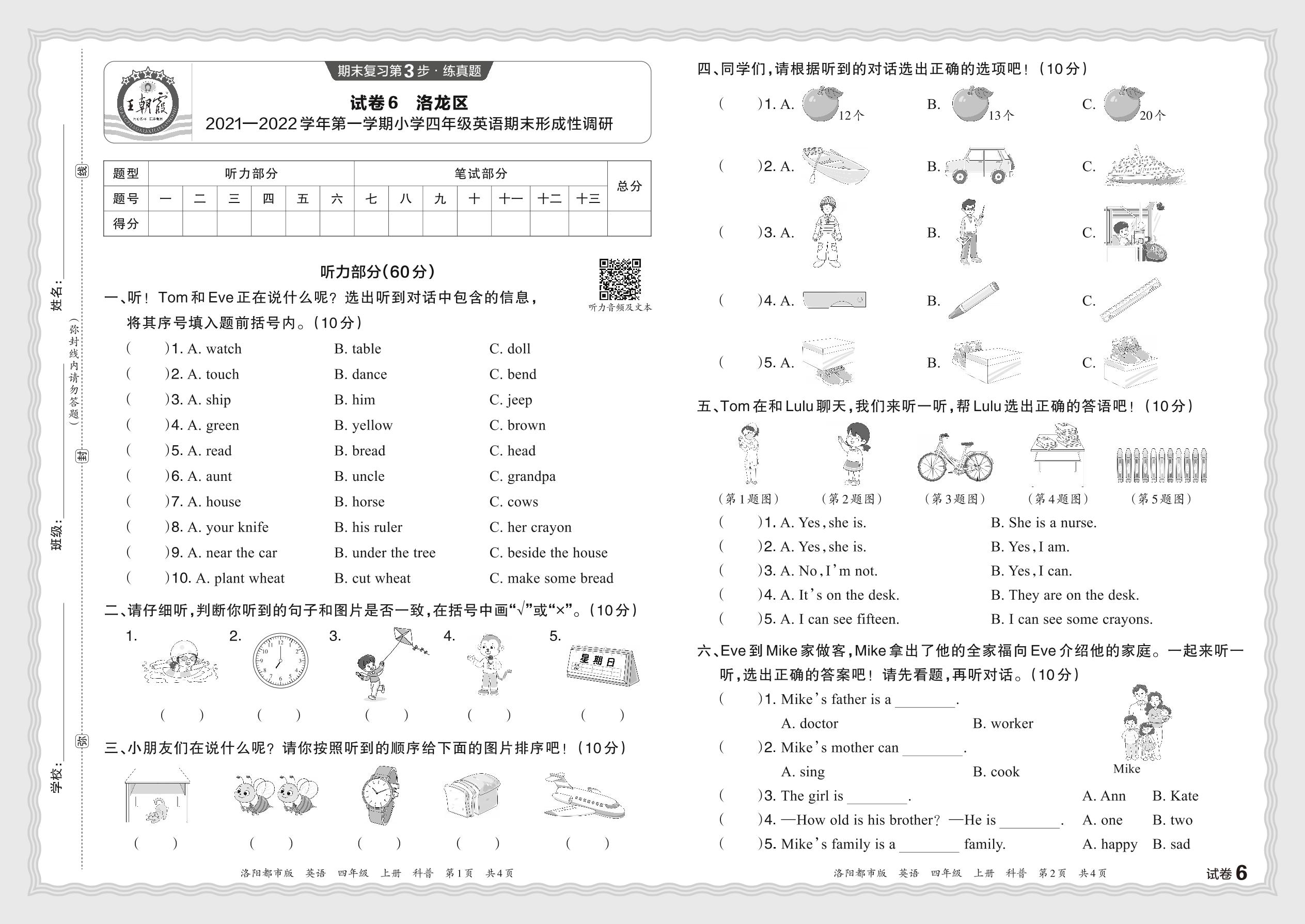 河南省洛阳市洛龙区2021—2022学年第一学期小学四年级英语期末形成性调研【6】