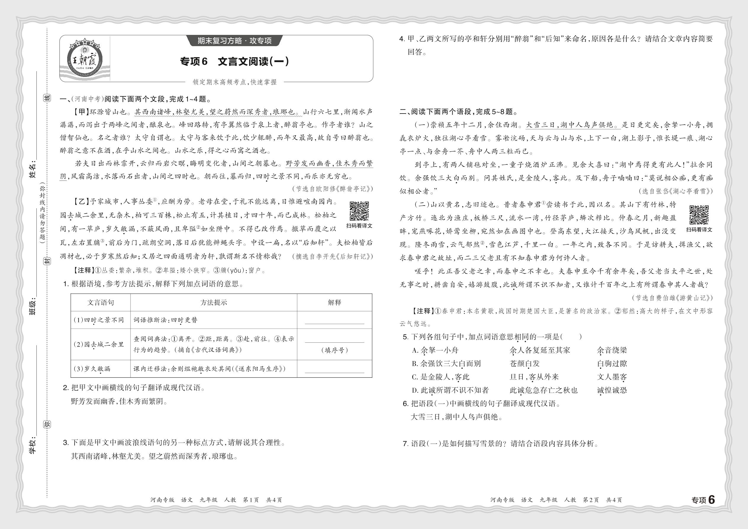 2023秋上册九年级语文人教版 期末专项卷·文言文阅读(一)【6】