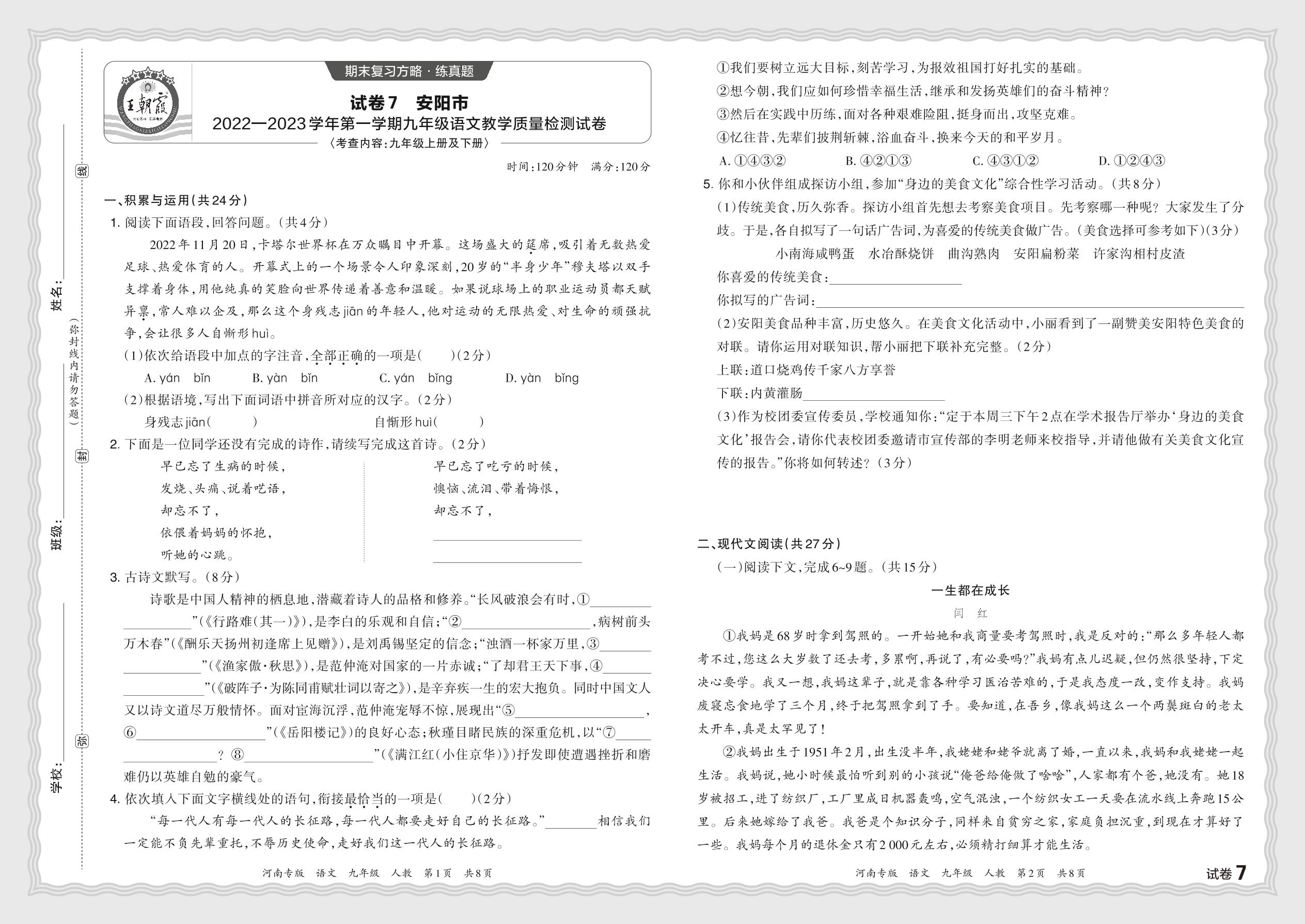 河南省安阳市2022—2023学年第一学期九年级语文教学质量检测试卷(人教版)【7】