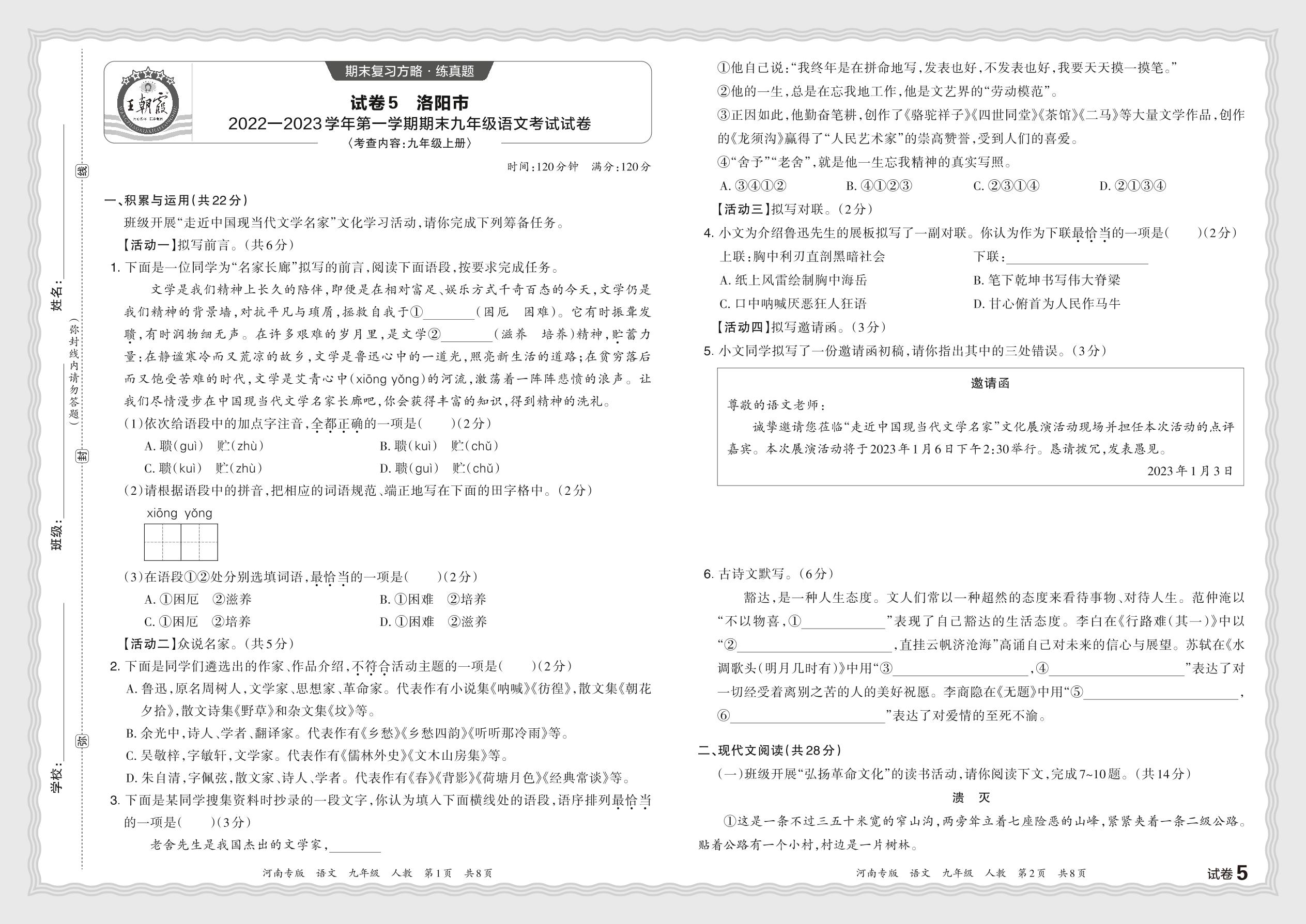 河南省洛阳市2022—2023学年第一学期期末九年级语文考试试卷(人教版)【5】