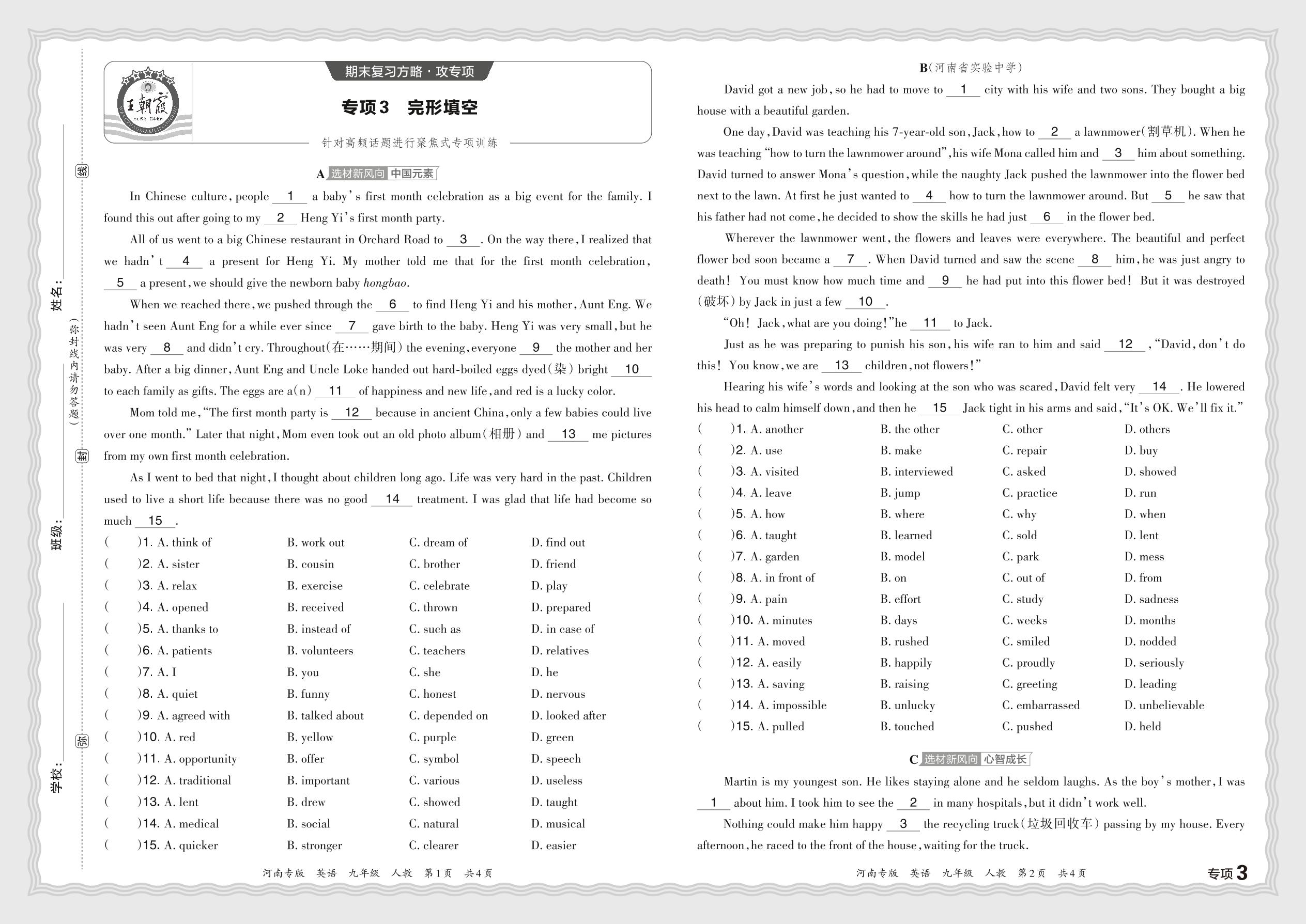 2023秋上册九年级英语人教版 期末专项卷·完形填空【3】